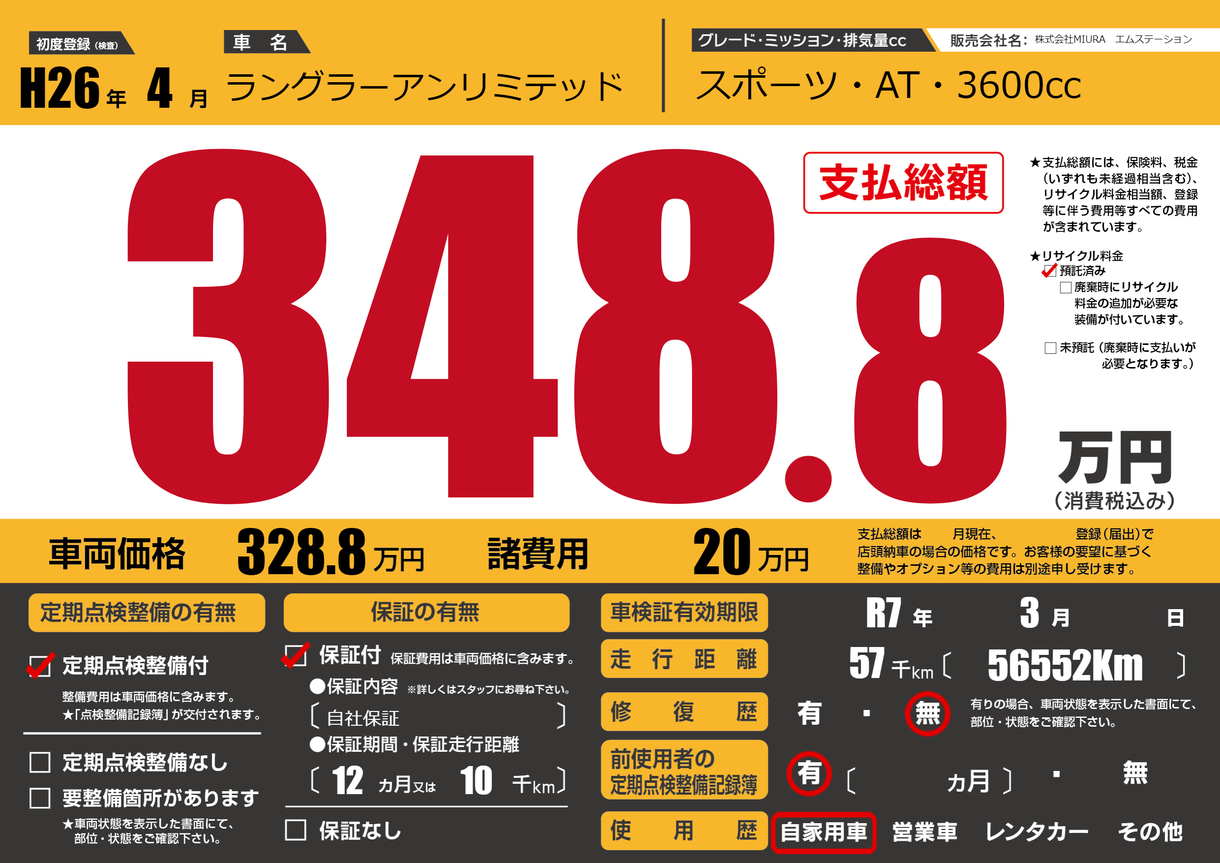 | 走行キロ | 5.7万km | 初年度登録 | H26年4月 |