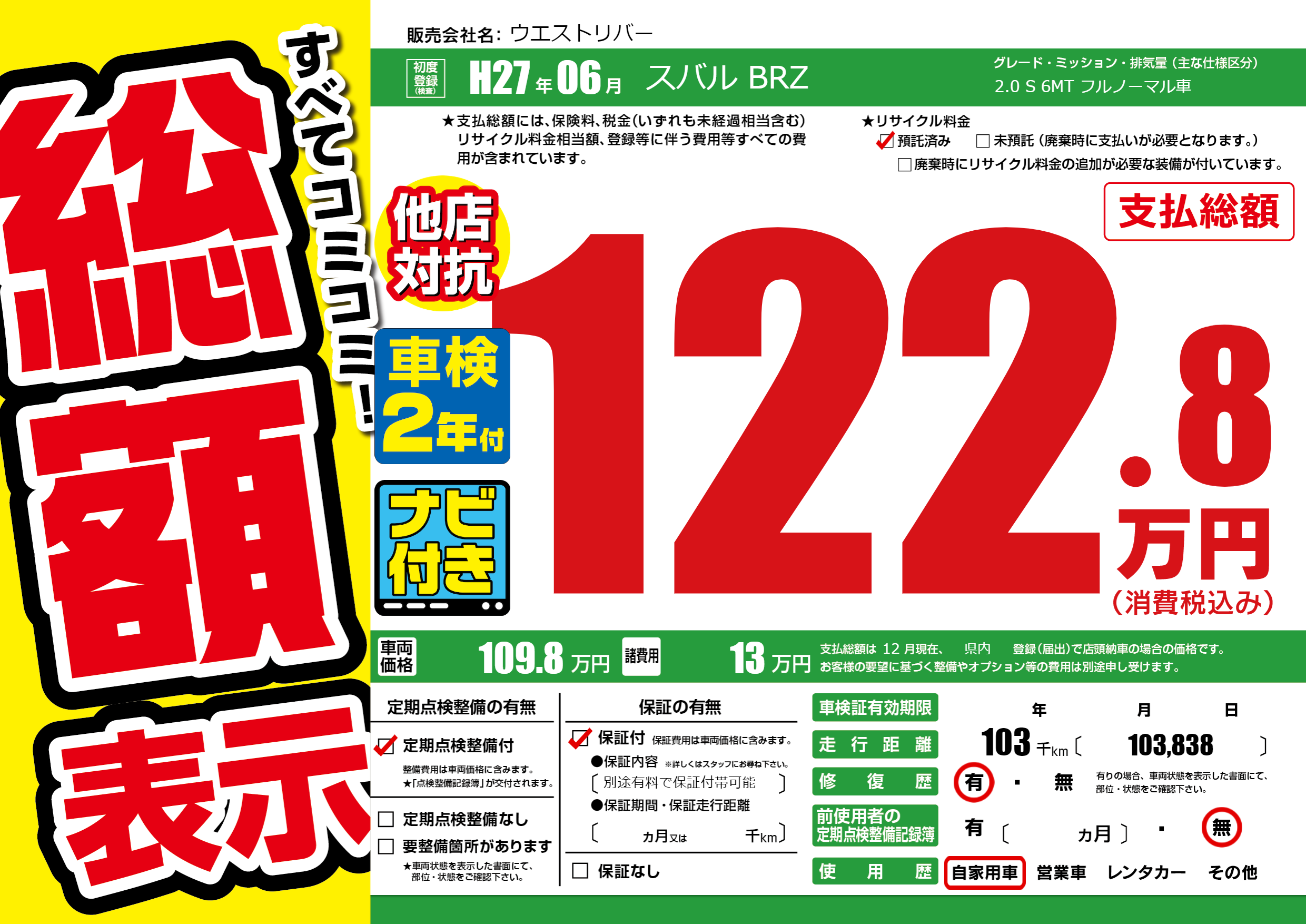 | 車名 | スバル BRZ | グレード ミッション 排気量 |