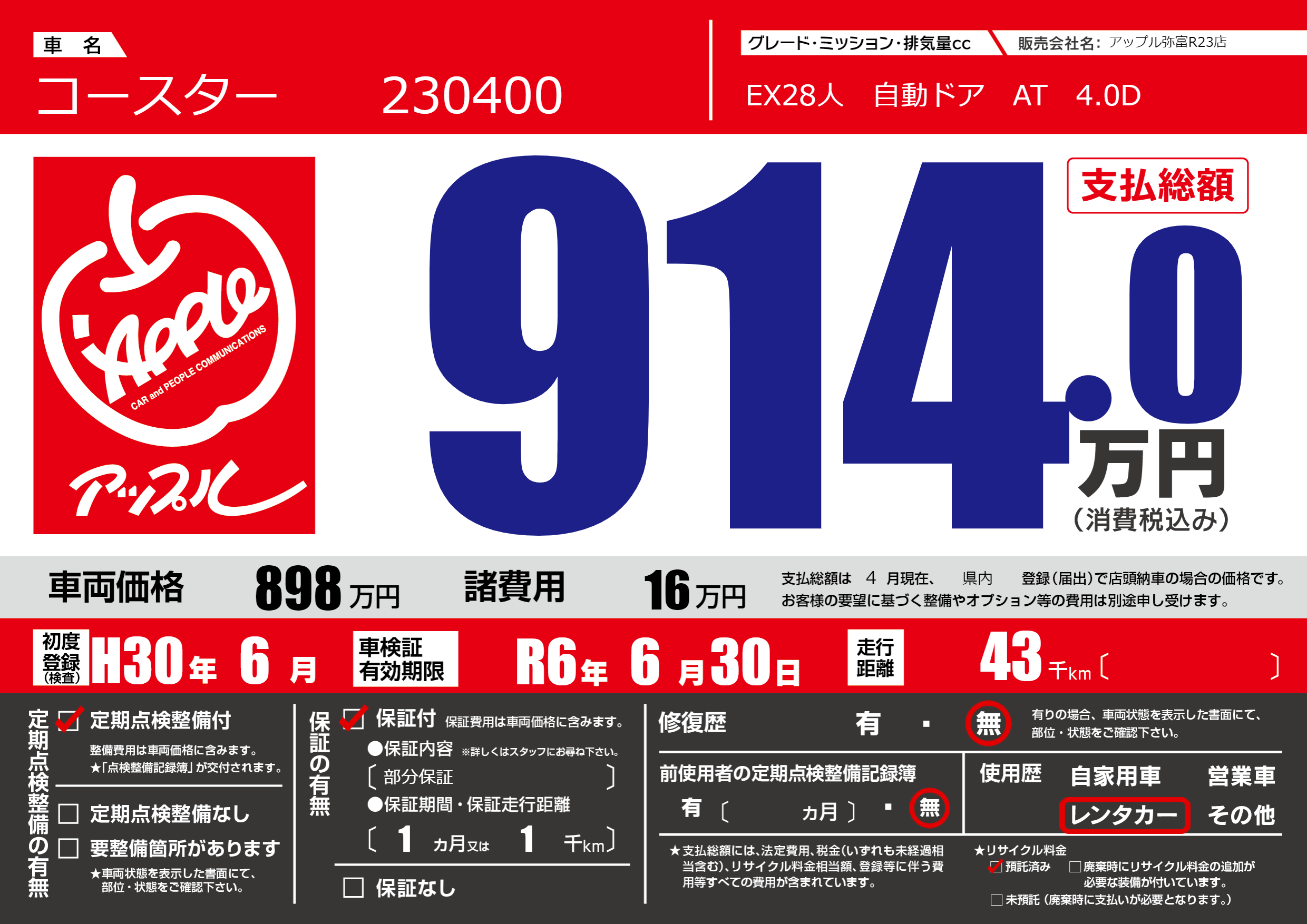 | 車名 | コースター 230400 | グレード ミッション 排気量 |