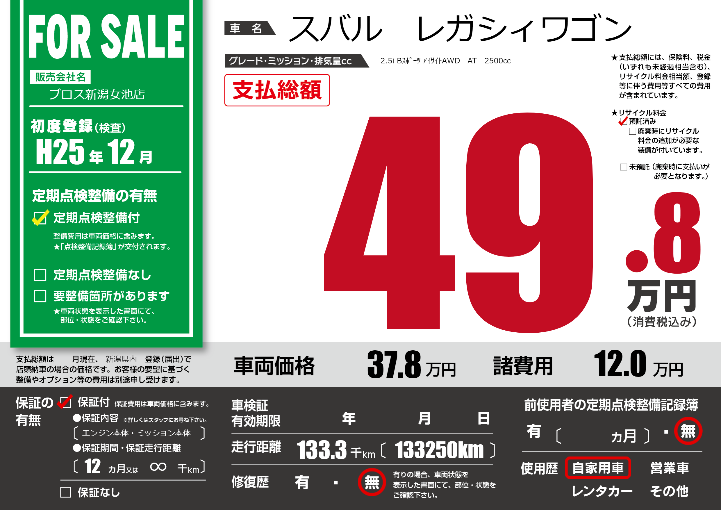 | 車名 | スバル レガシィワゴン | グレード ミッション 排気量 |
