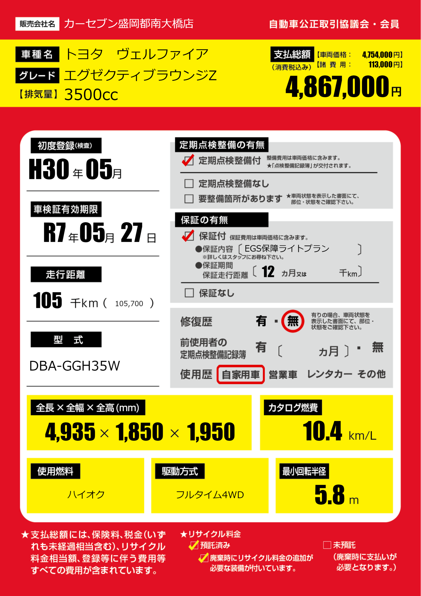 | 車名 | トヨタ ヴェルファイア | グレード ミッション 排気量 |
