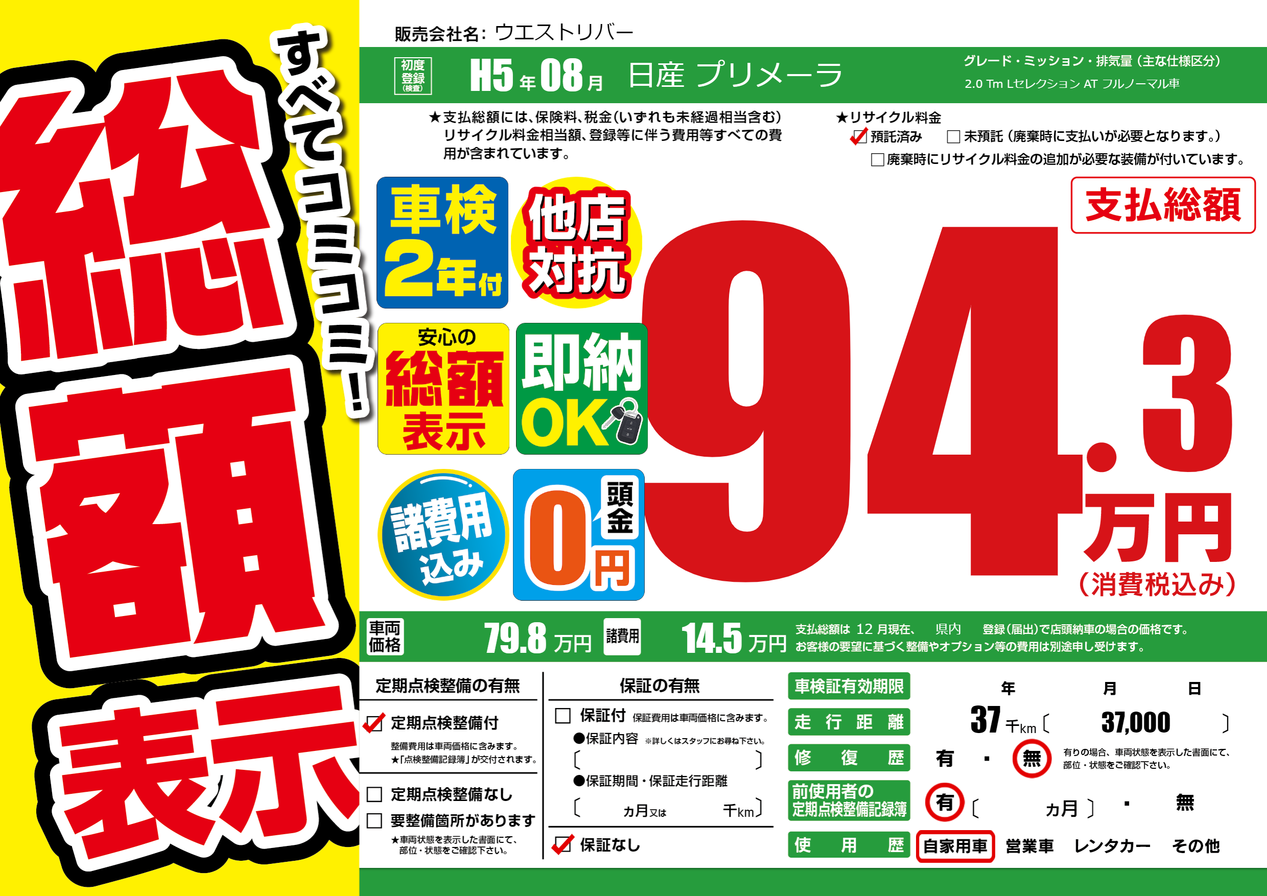 | 車名 | 日産 プリメーラ | グレード ミッション 排気量 |