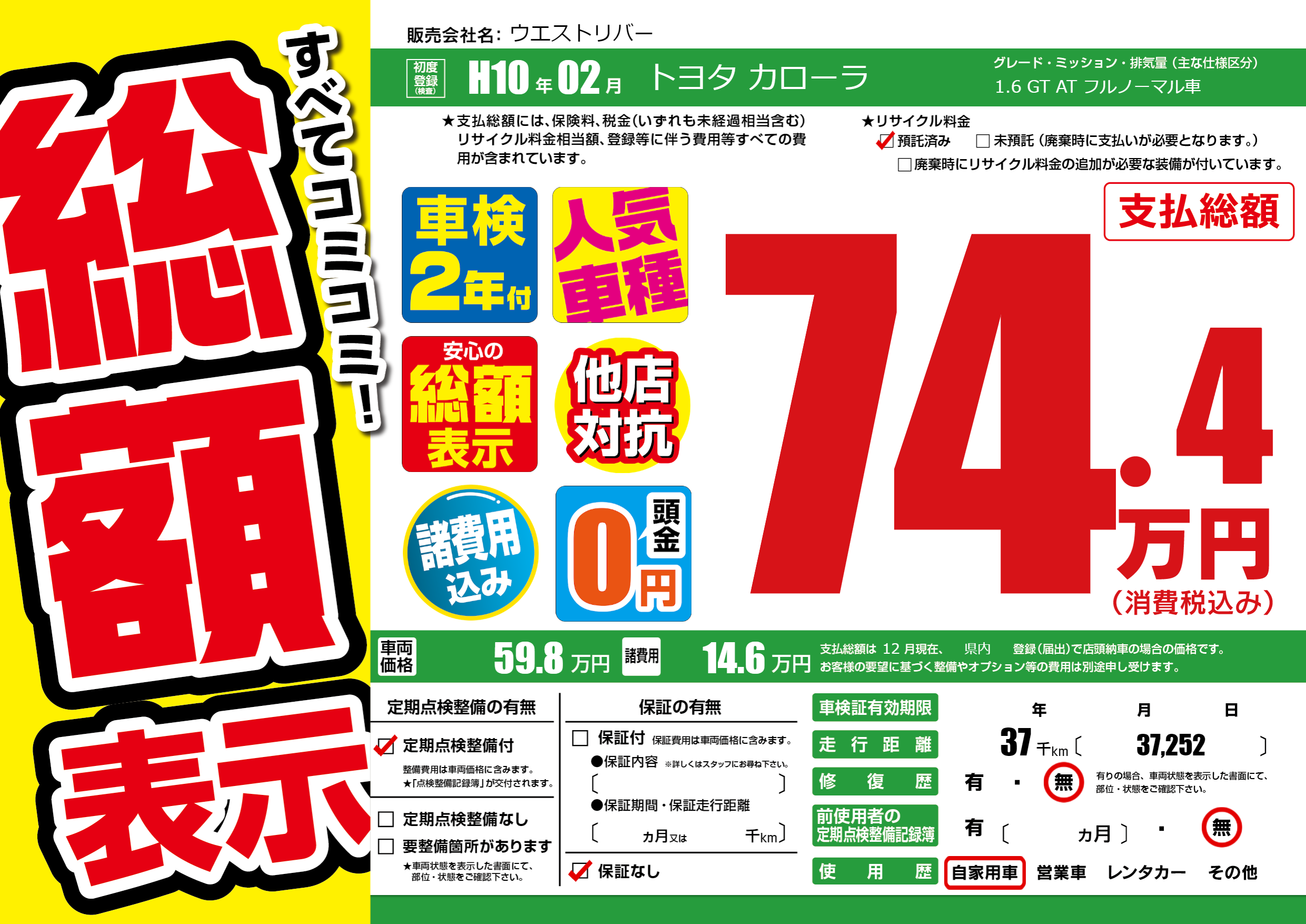 | 走行キロ | 3.7万km | 初年度登録 | H10年02月 |