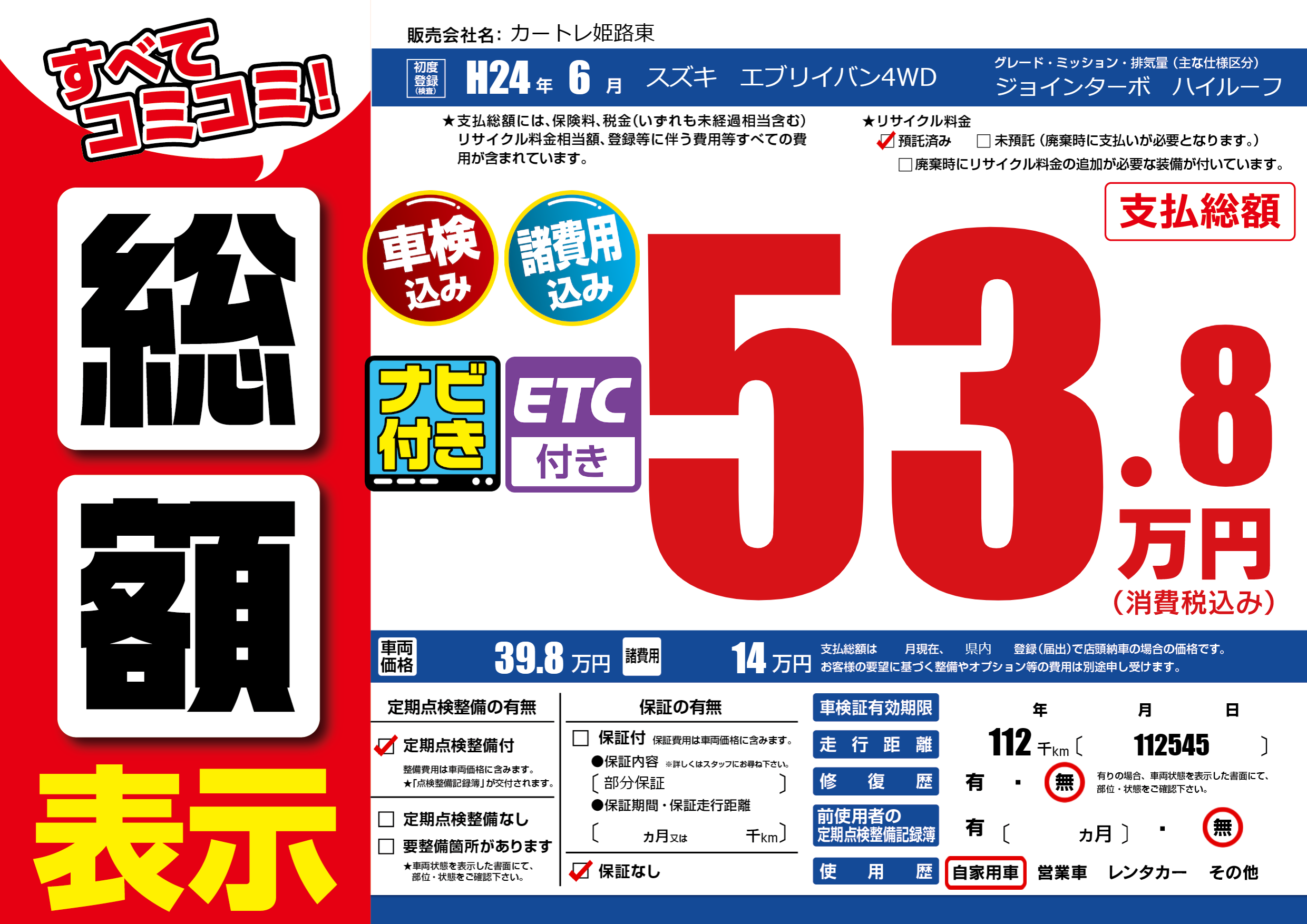 | 走行キロ | 11.2万km | 初年度登録 | H24年6月 |