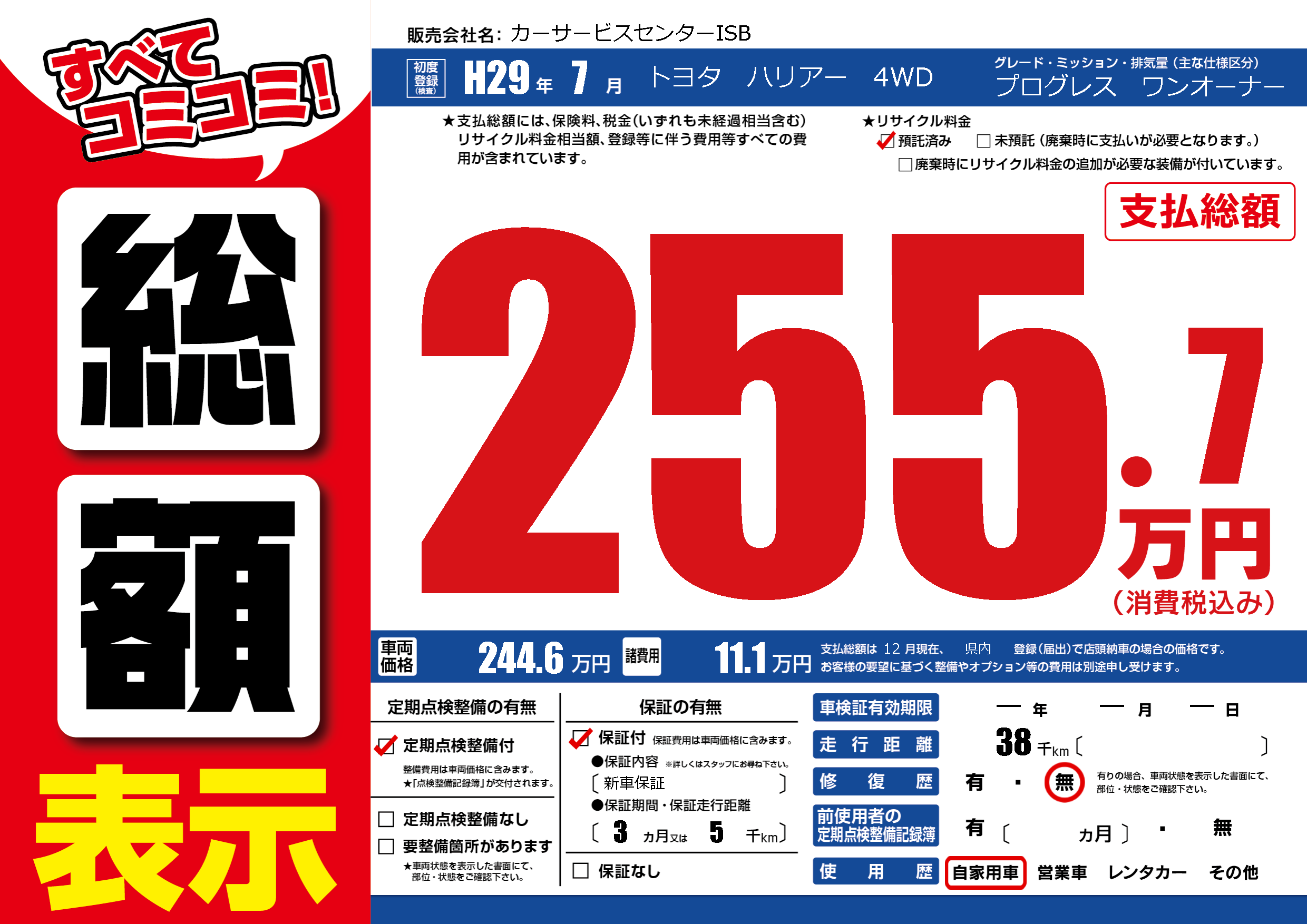 | 走行キロ | 3.8万km | 初年度登録 | H29年7月 |