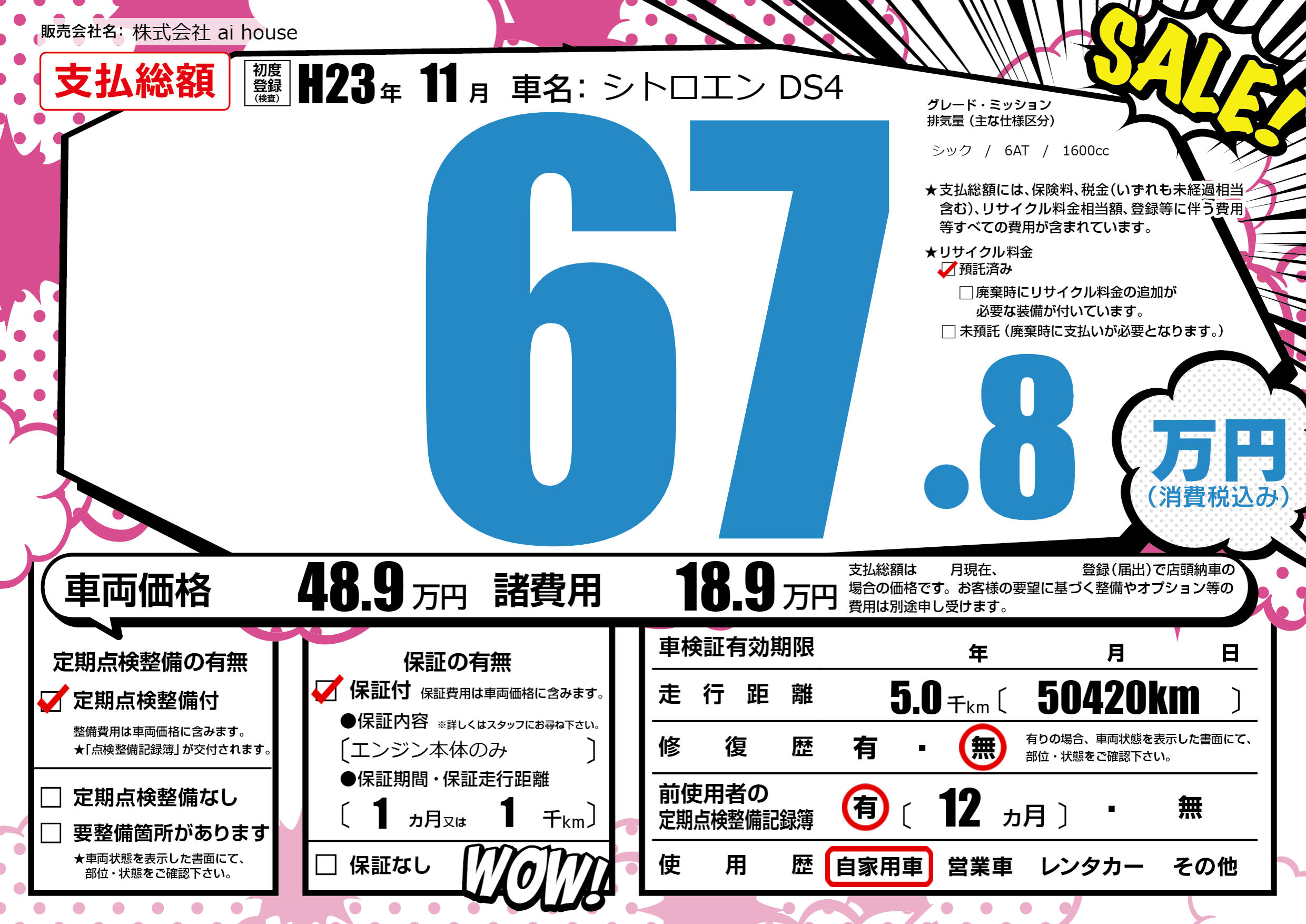 | 車名 | シトロエン DS4 | グレード ミッション 排気量 |