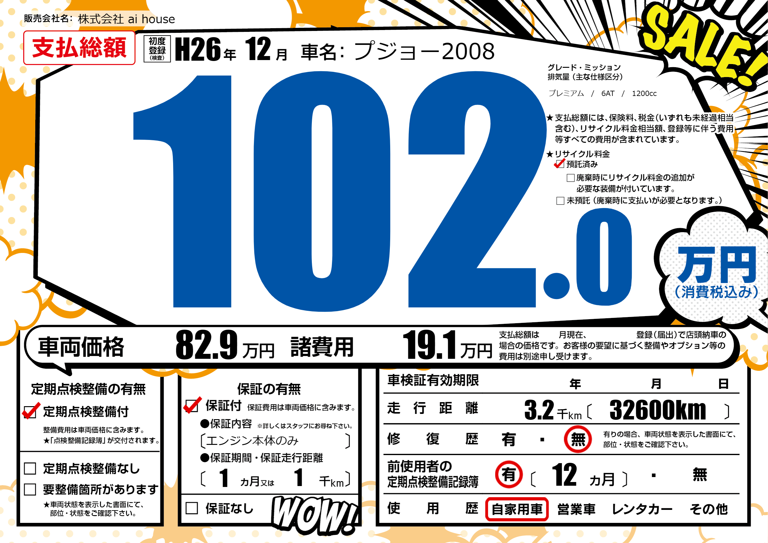 | 車名 | プジョー2008 | グレード ミッション 排気量 |