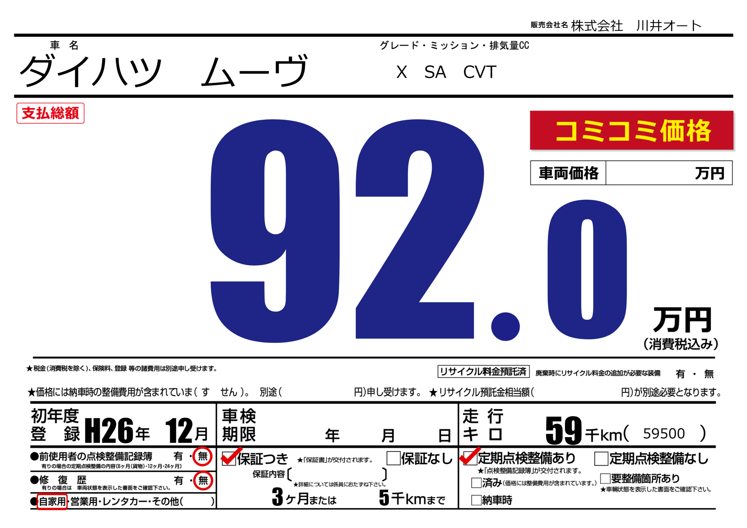 | 車名 | ダイハツ ムーヴ | グレード ミッション 排気量 |