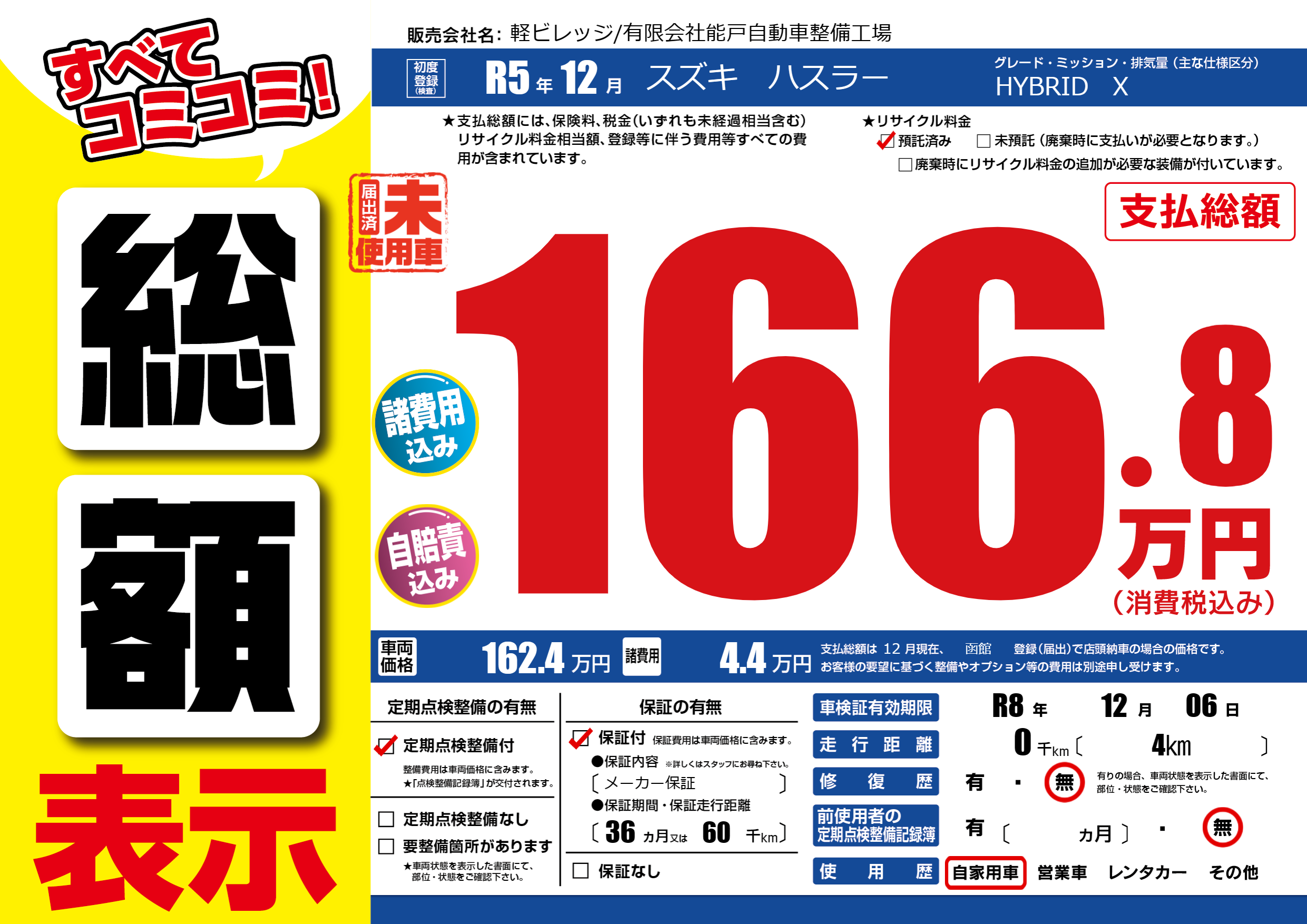 | 車名 | スズキ ハスラー | グレード ミッション 排気量 |