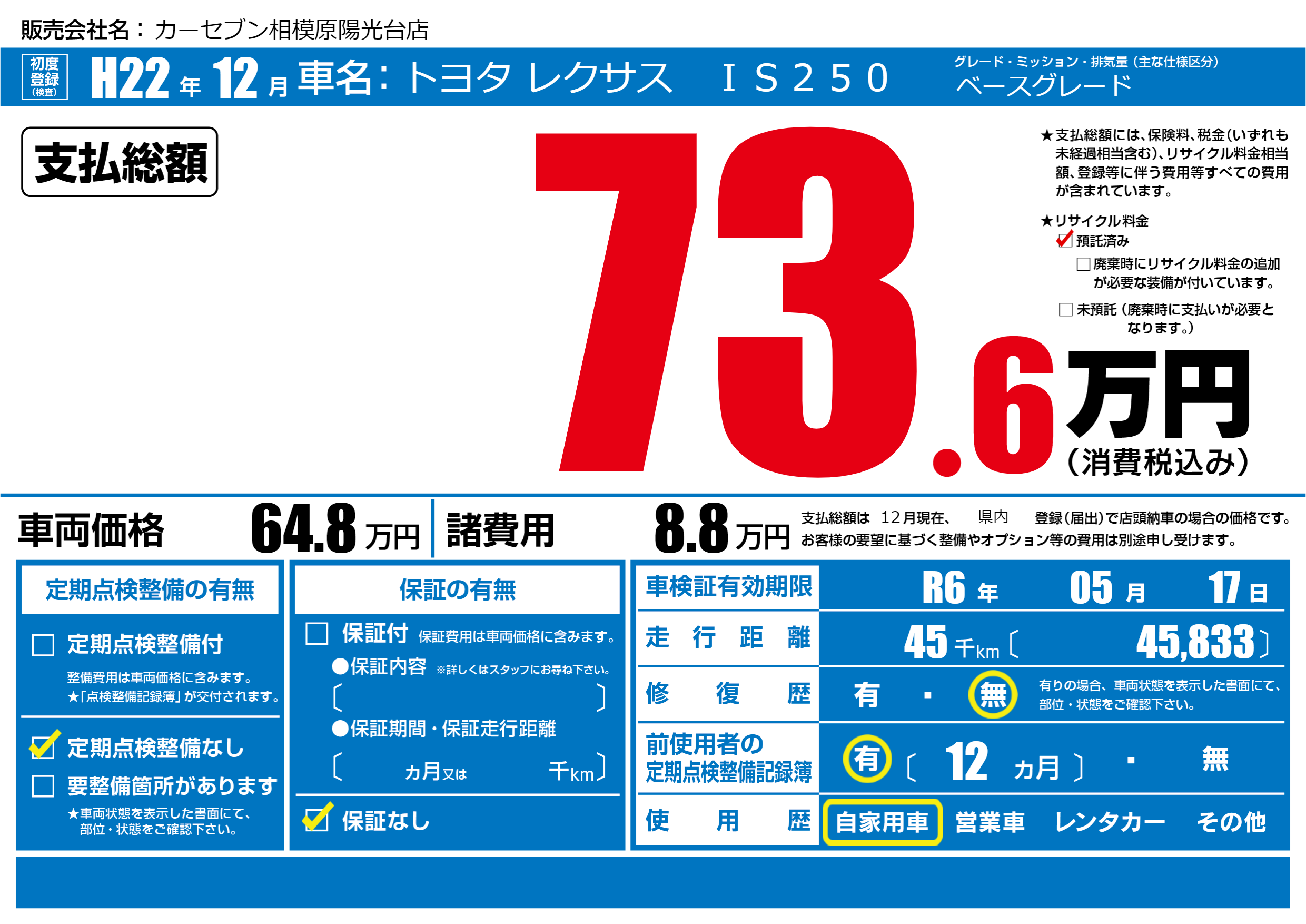 | 走行キロ | 4.5万km | 初年度登録 | H22年12月 |