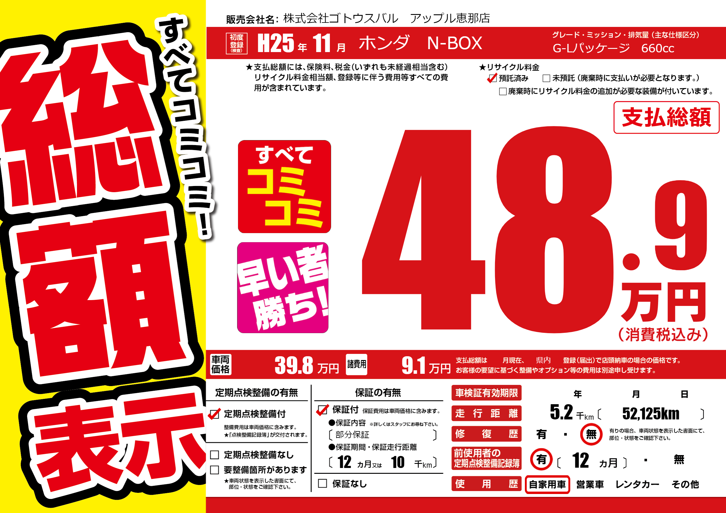 | 車名 | ホンダ N-BOX | グレード ミッション 排気量 |