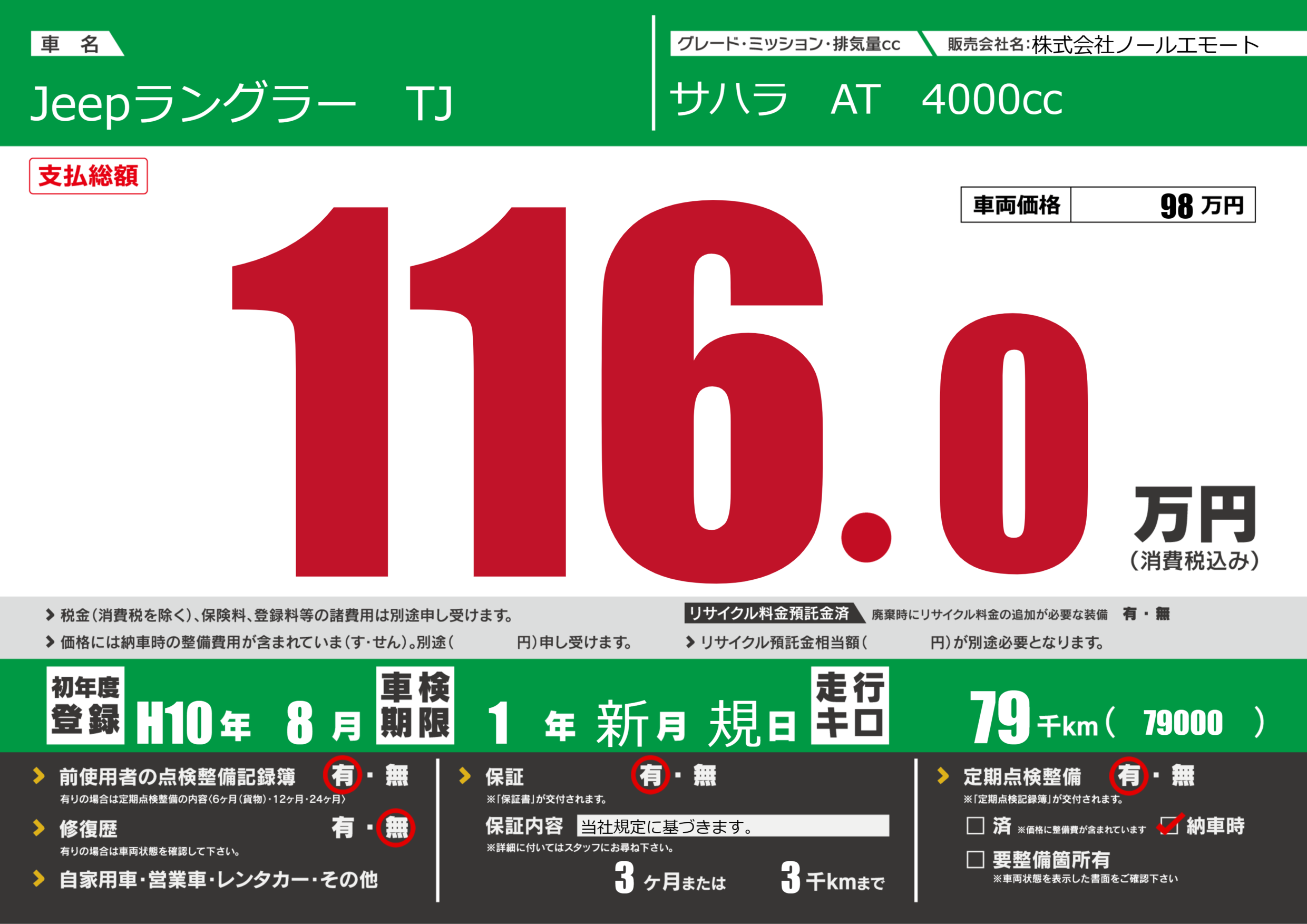 | 車名 | Jeepラングラー TJ | グレード ミッション 排気量 |