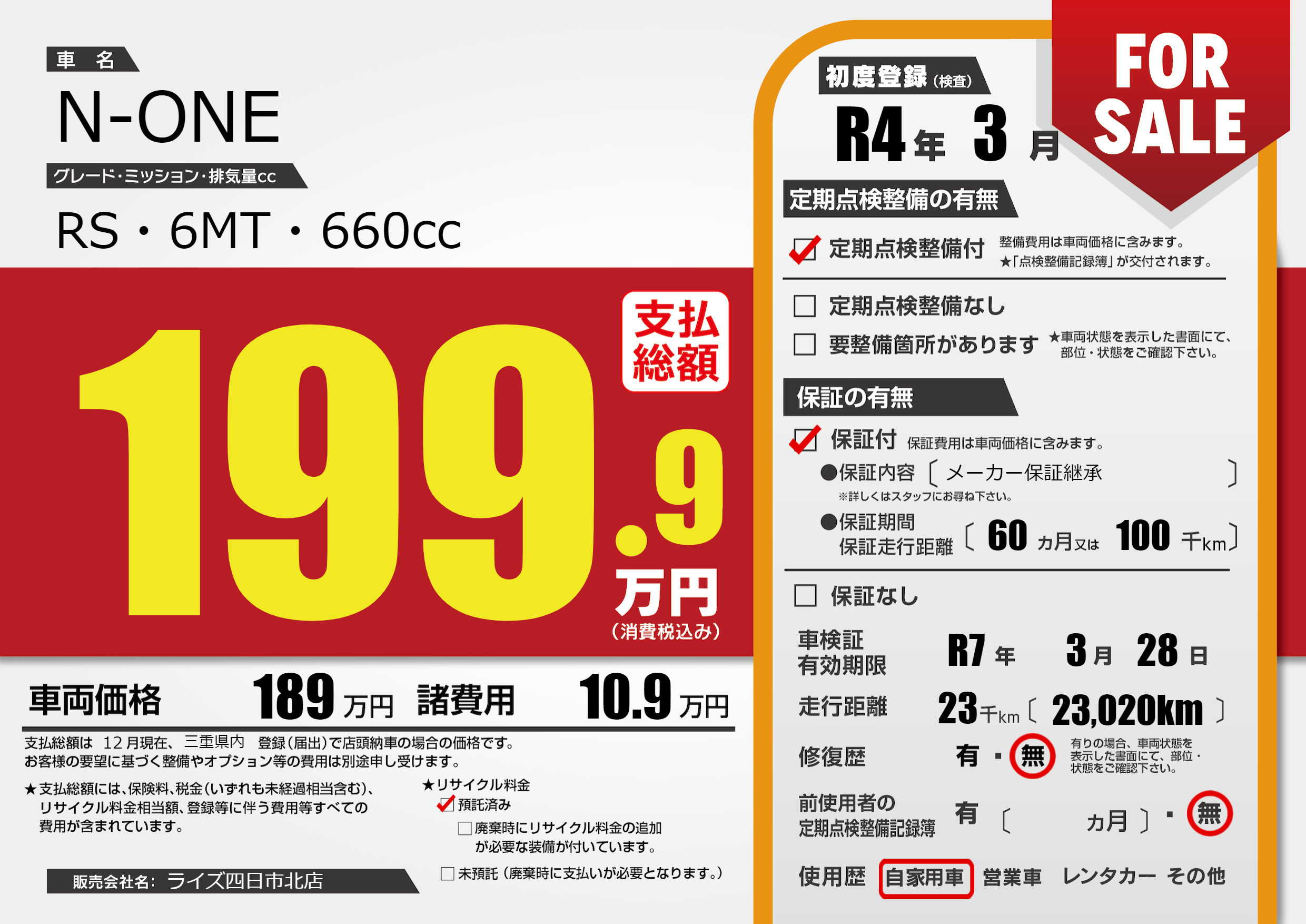 | 車名 | N-ONE | グレード ミッション 排気量 |