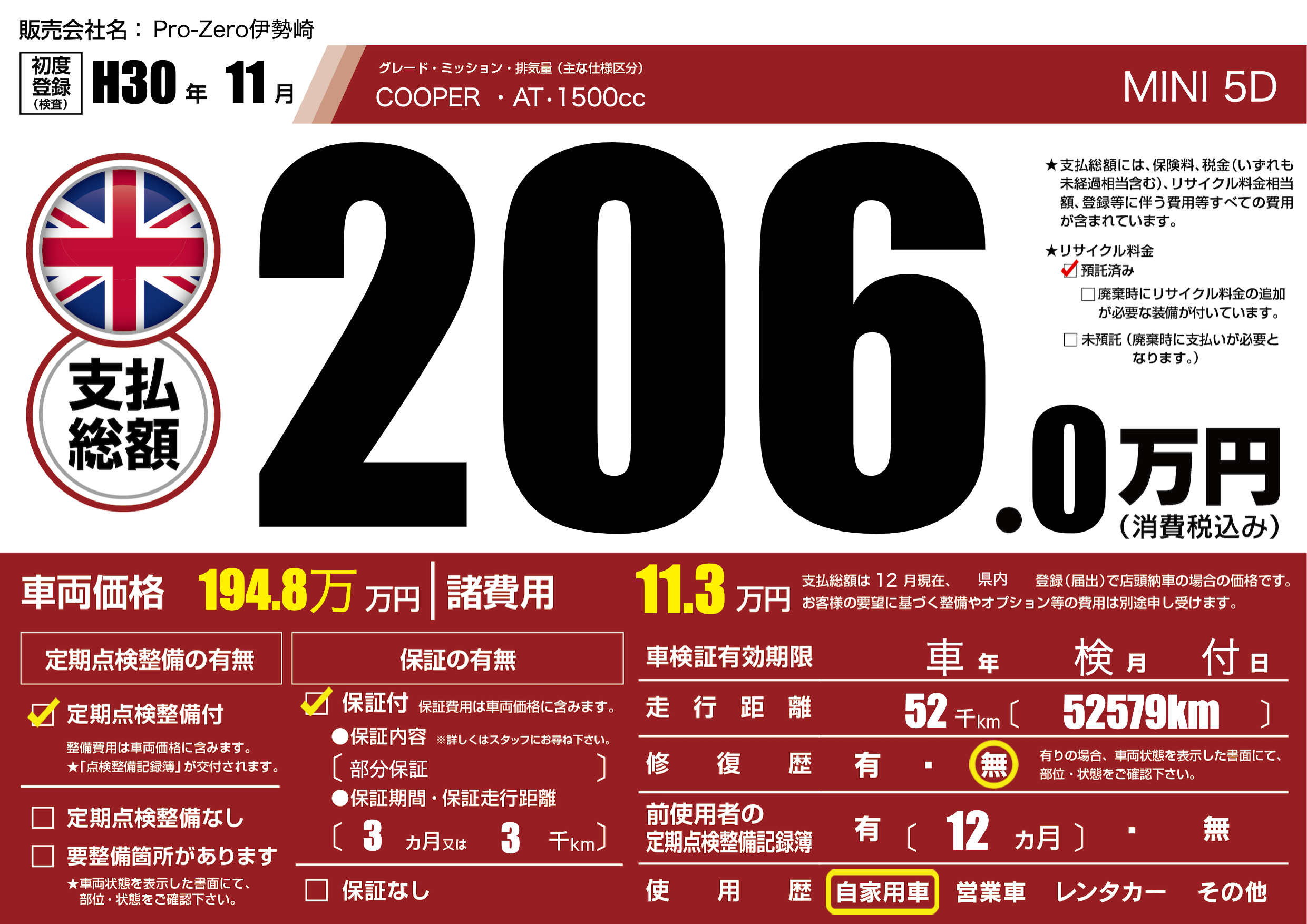 保証付き 保証内容(部分保証) 3ヶ月または(3)千kmまで |