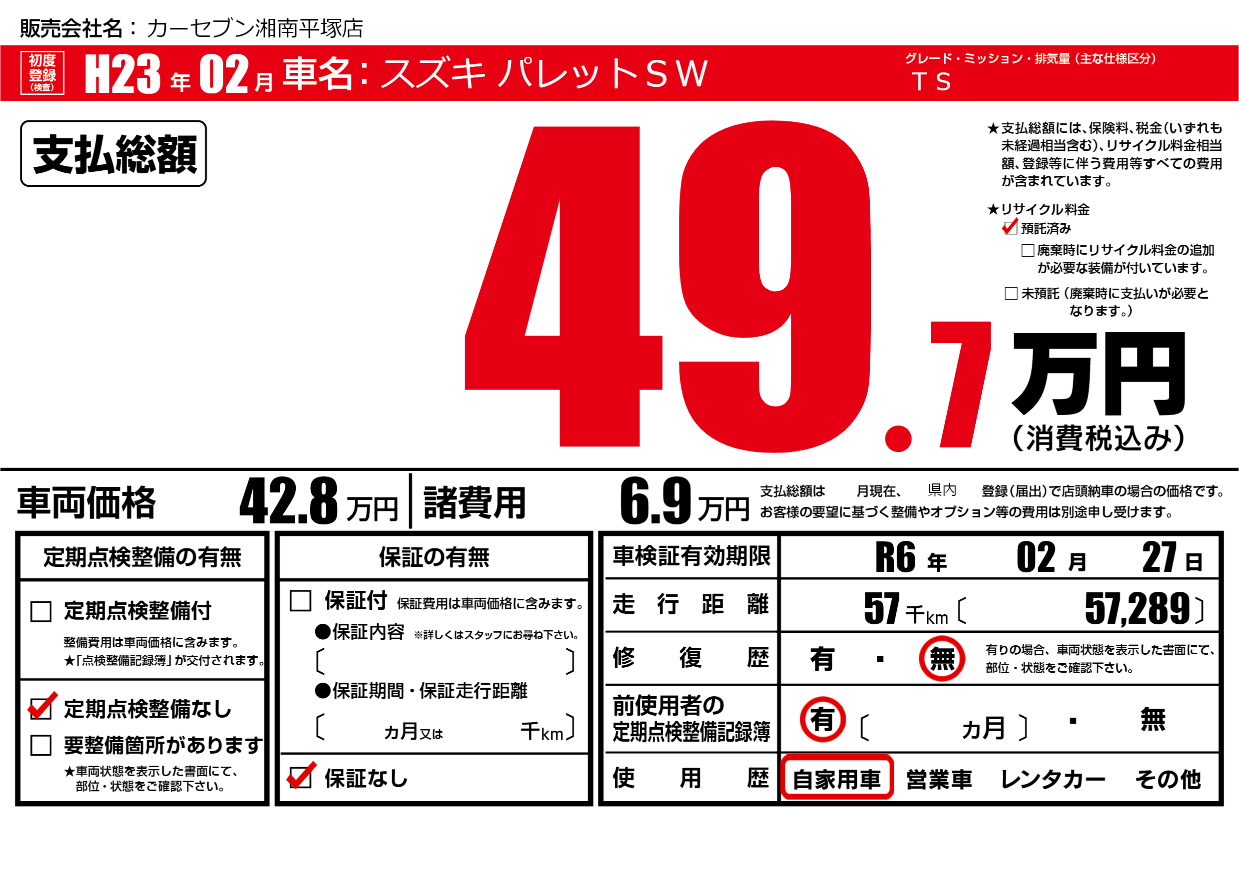 | 走行キロ | 5.7万km | 初年度登録 | H23年02月 |