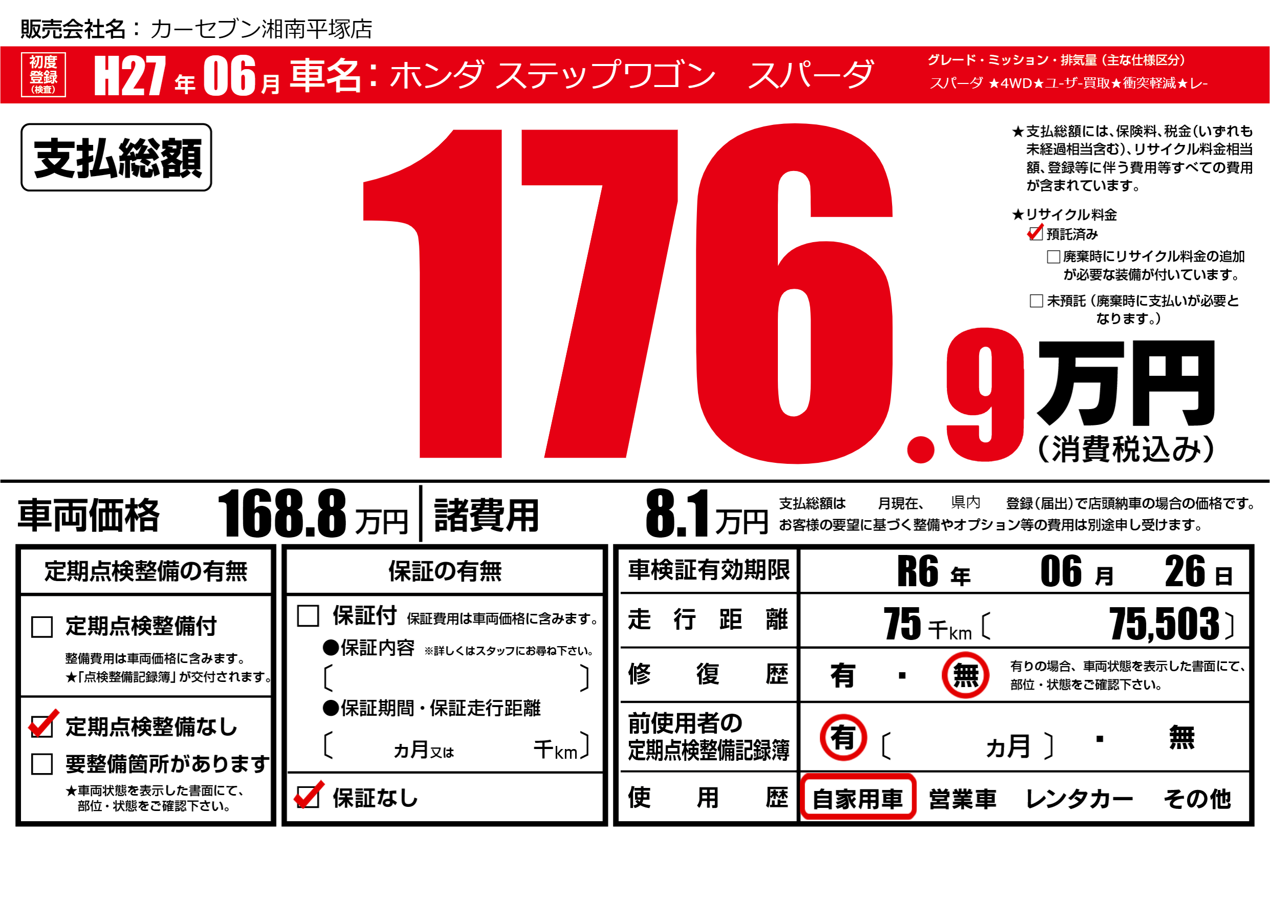 | 走行キロ | 7.5万km | 初年度登録 | H27年06月 |