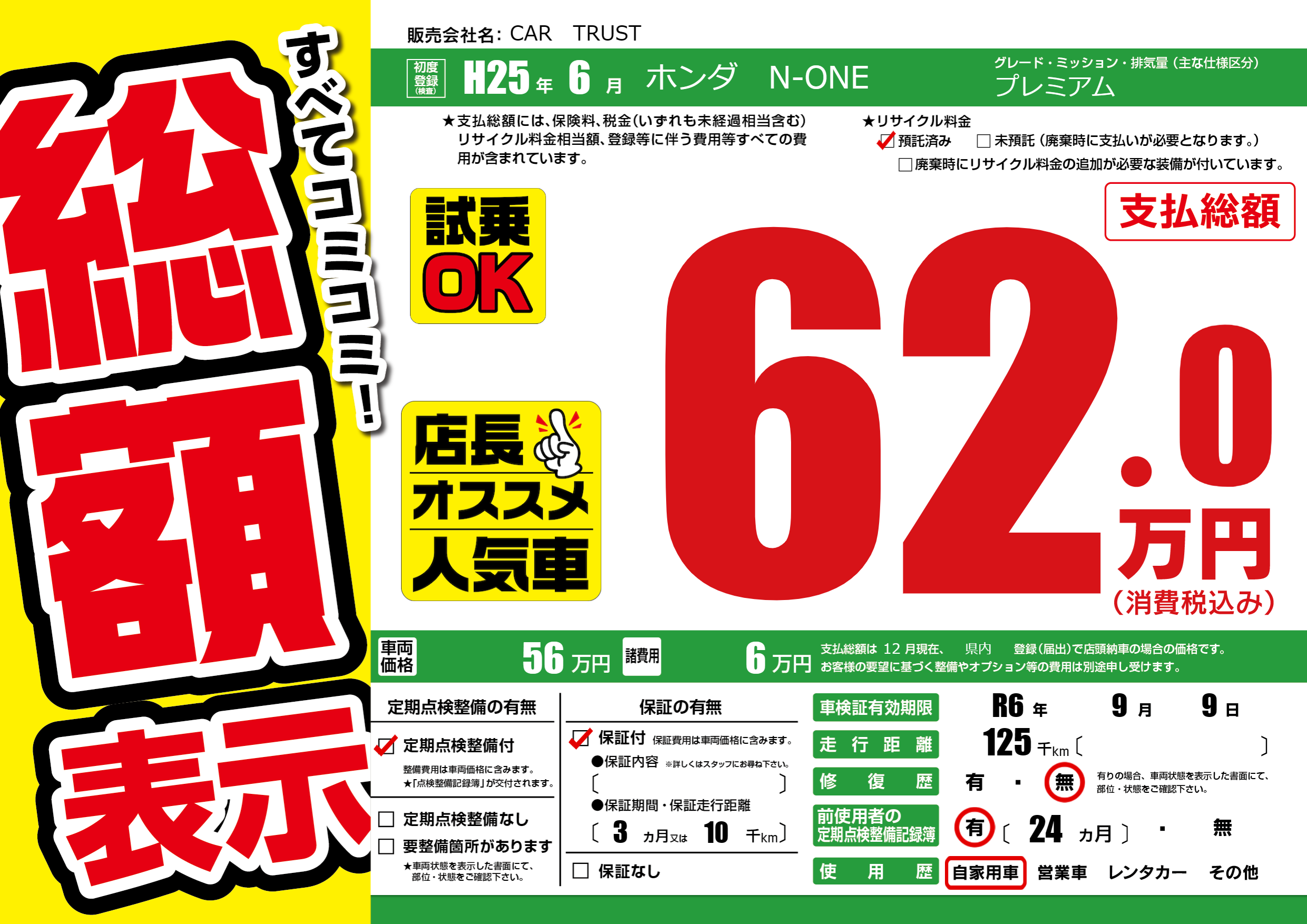 | 車名 | ホンダ N-ONE | グレード ミッション 排気量 |