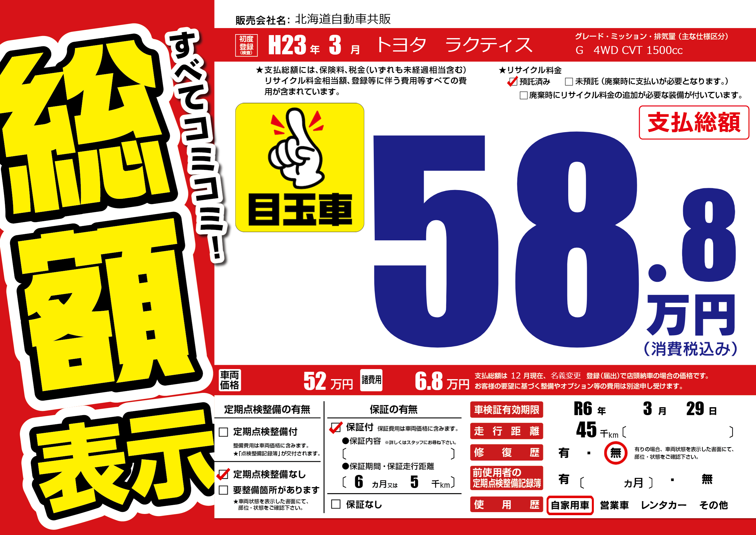 | 車検制限 | R6年 3月 29日 | ||