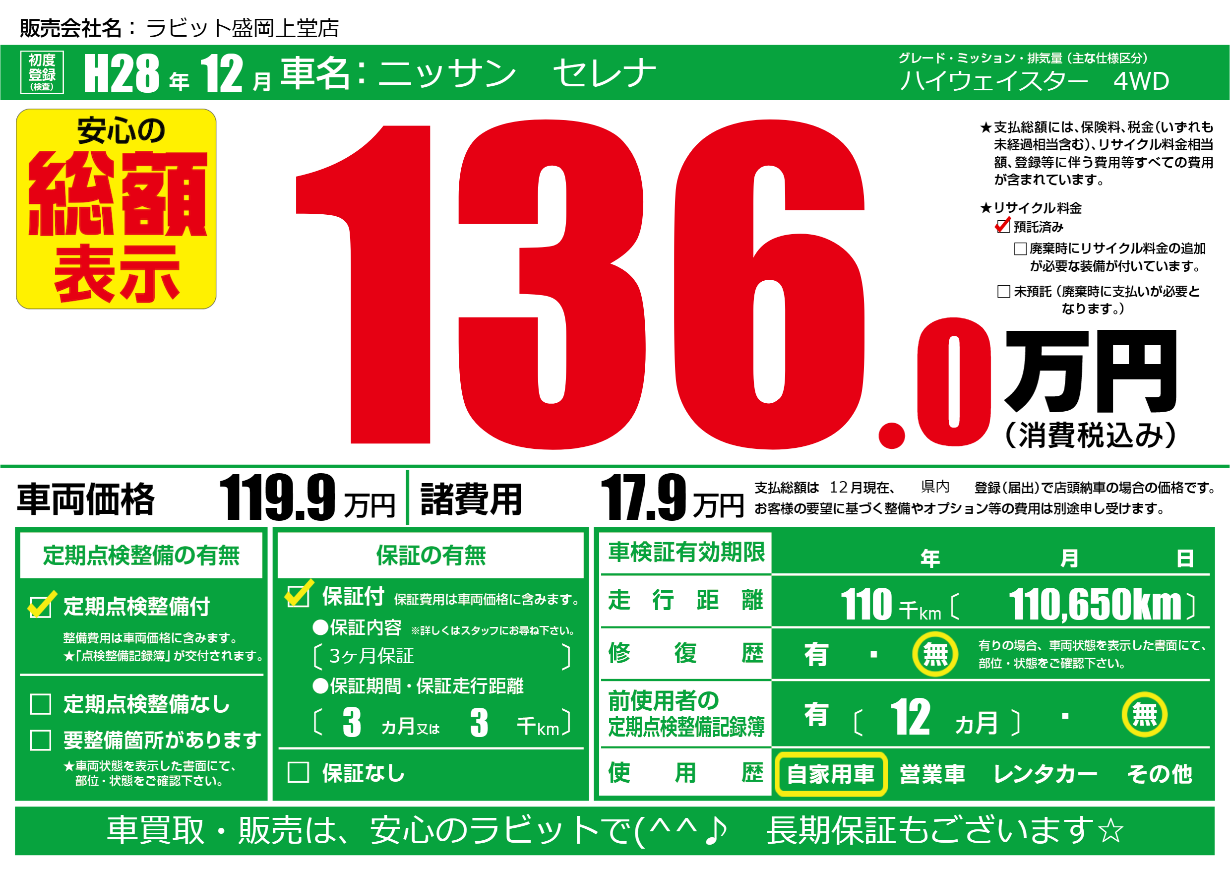 | 走行キロ | 11万km | 初年度登録 | H28年12月 |