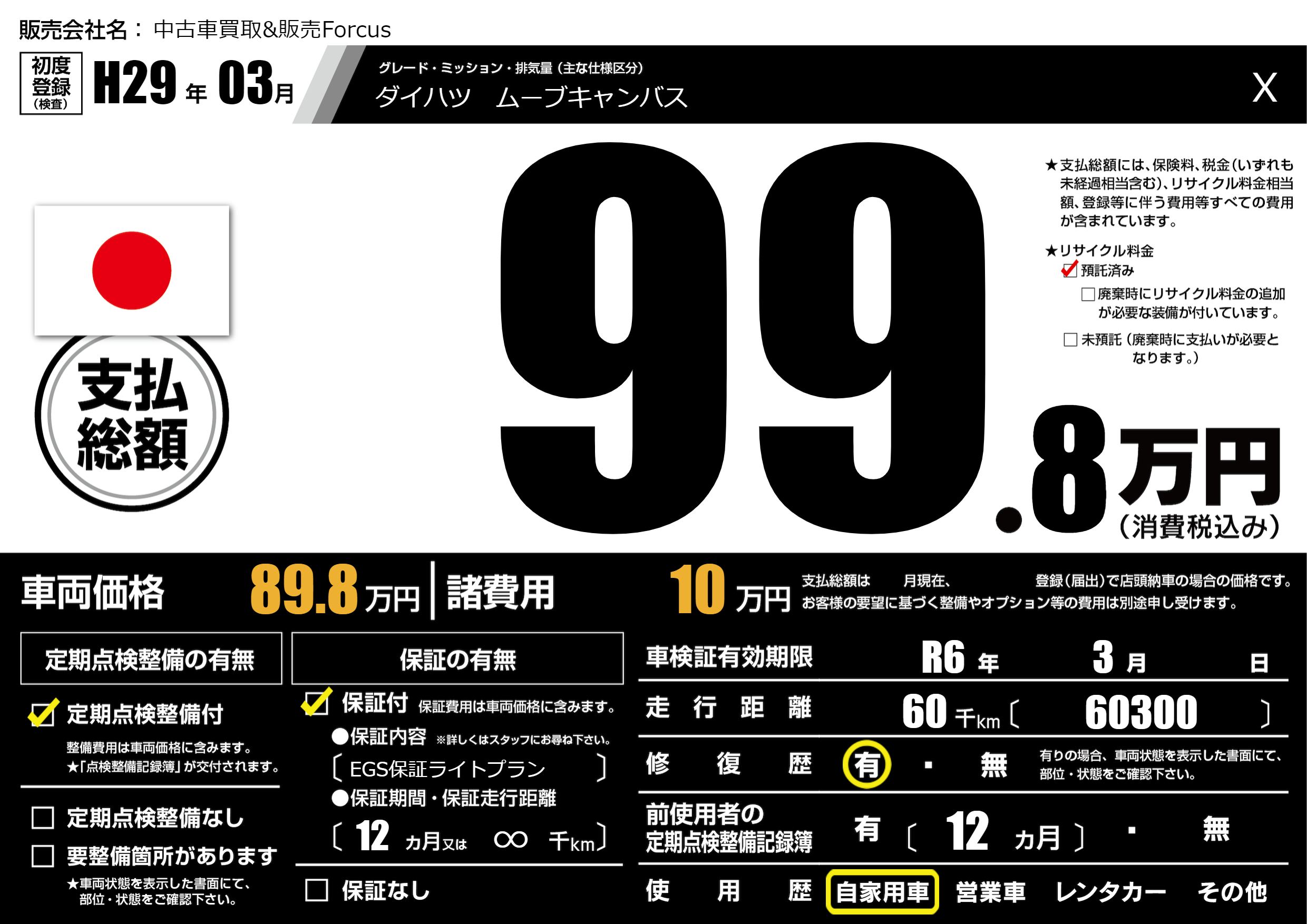 | 走行キロ | 6万km | 初年度登録 | H29年03月 |