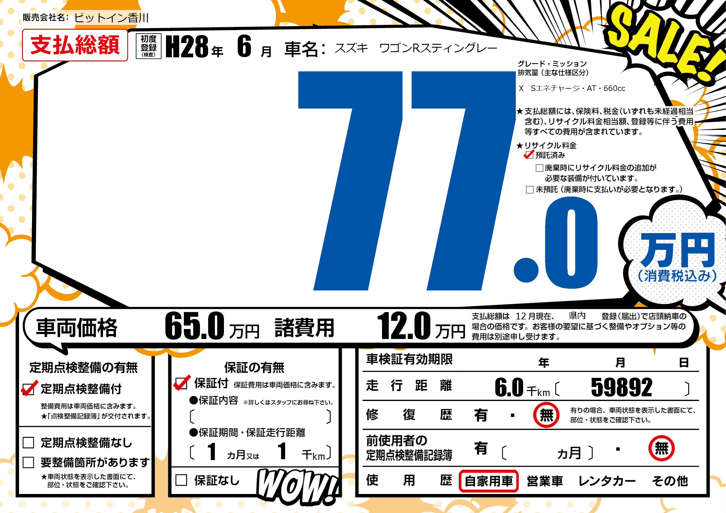 | 車名 | スズキ ワゴンRスティングレー | グレード ミッション 排気量 |