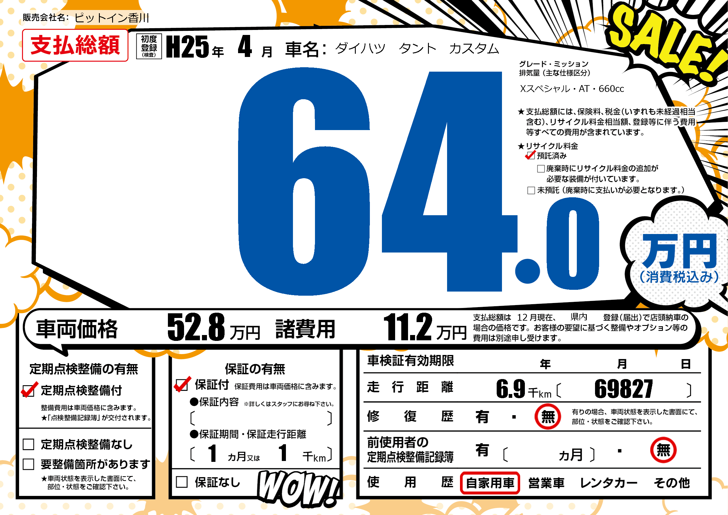 | 車名 | ダイハツ タント カスタム | グレード ミッション 排気量 |