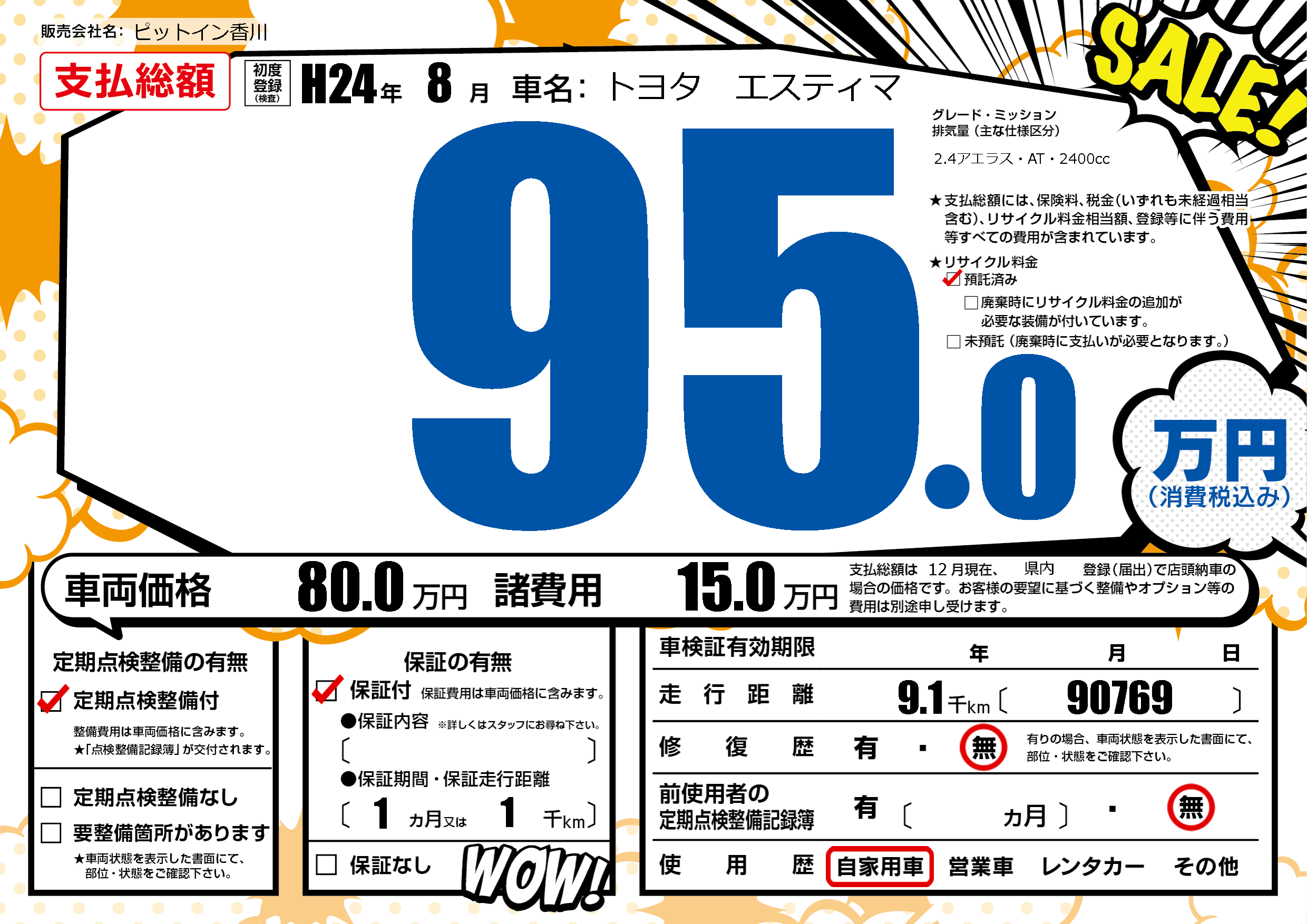 | 車名 | トヨタ エスティマ | グレード ミッション 排気量 |