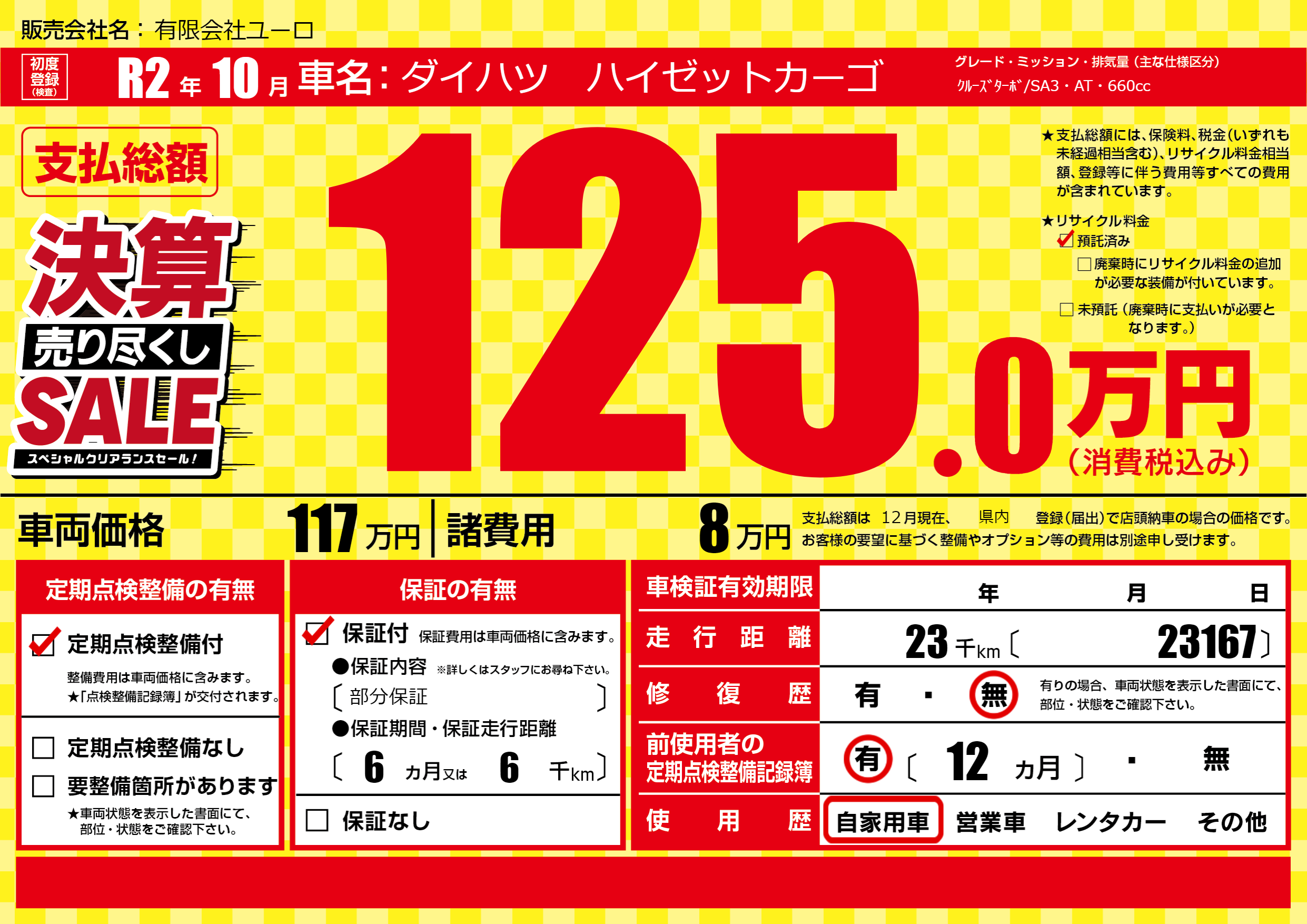 | 車名 | ダイハツ ハイゼットカーゴ | グレード ミッション 排気量 |