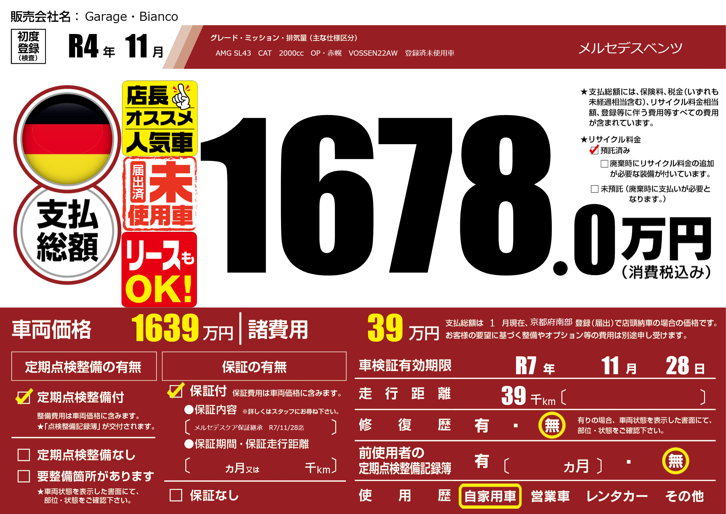 保証付き 保証内容(メルセデスケア保証継承 R7/11/28迄) ヶ月または千km |