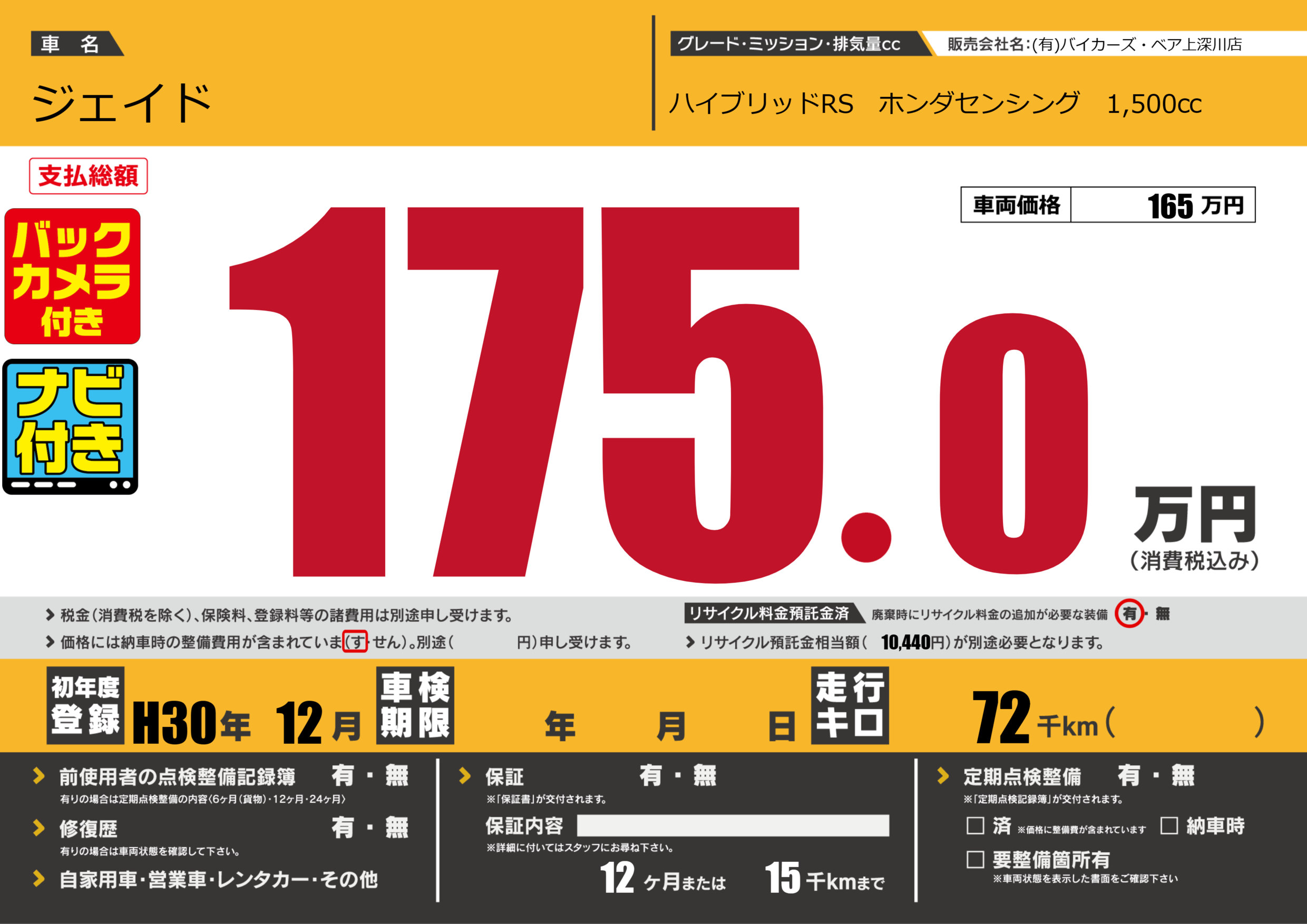 | 車名 | ジェイド | グレード ミッション 排気量 |