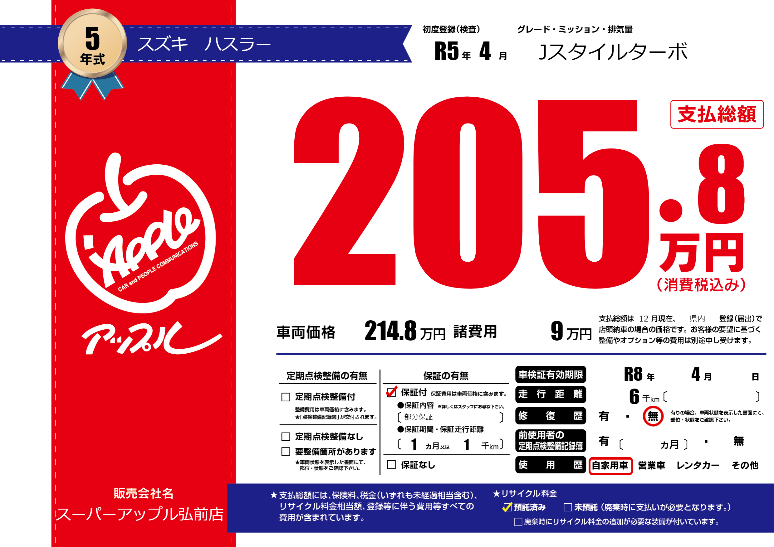 | 走行キロ | 0.6万km | 初年度登録 | R5年4月 |