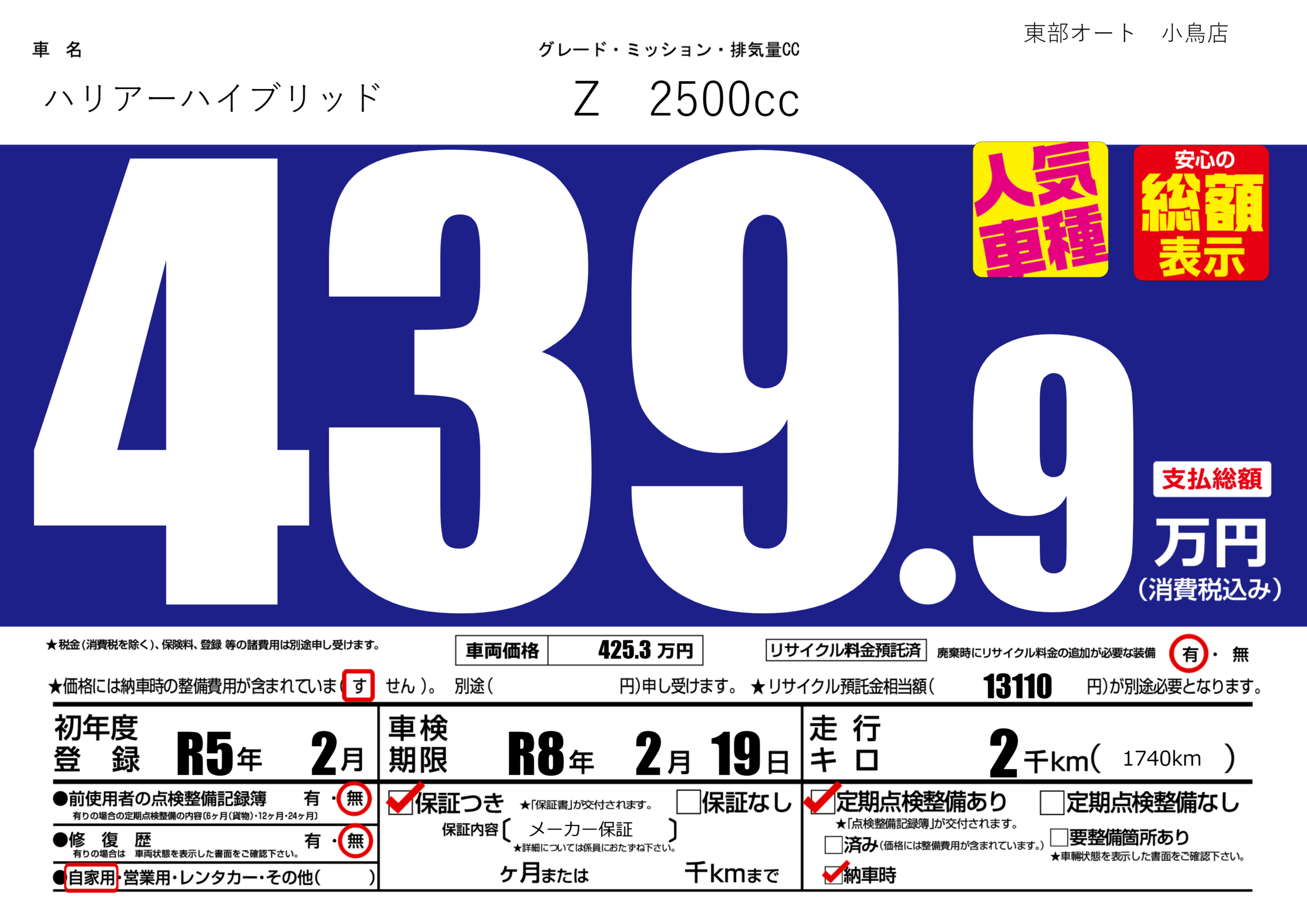 | 車名 | ハリアーハイブリッド | グレード ミッション 排気量 |