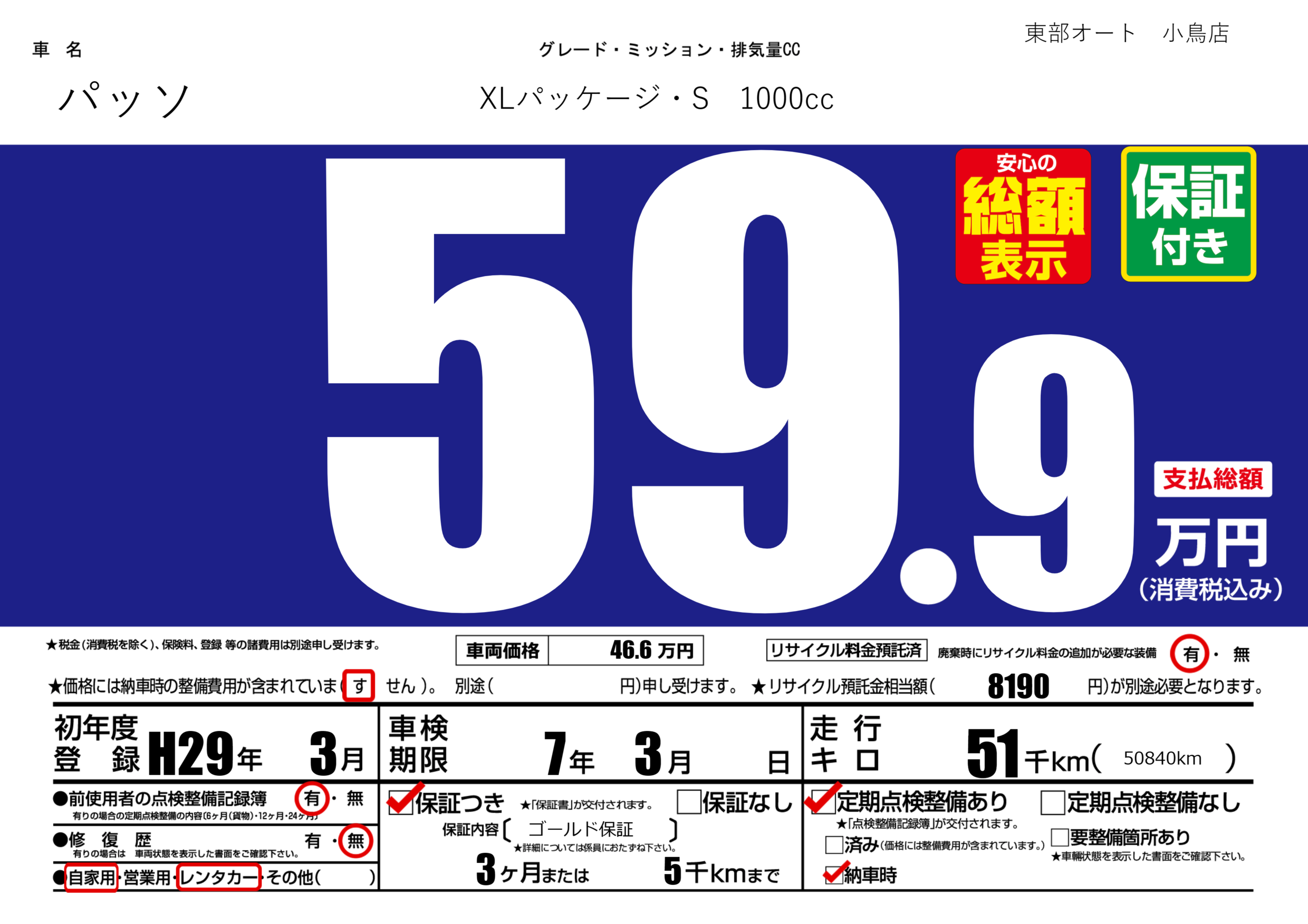 | 車名 | パッソ | グレード ミッション 排気量 |