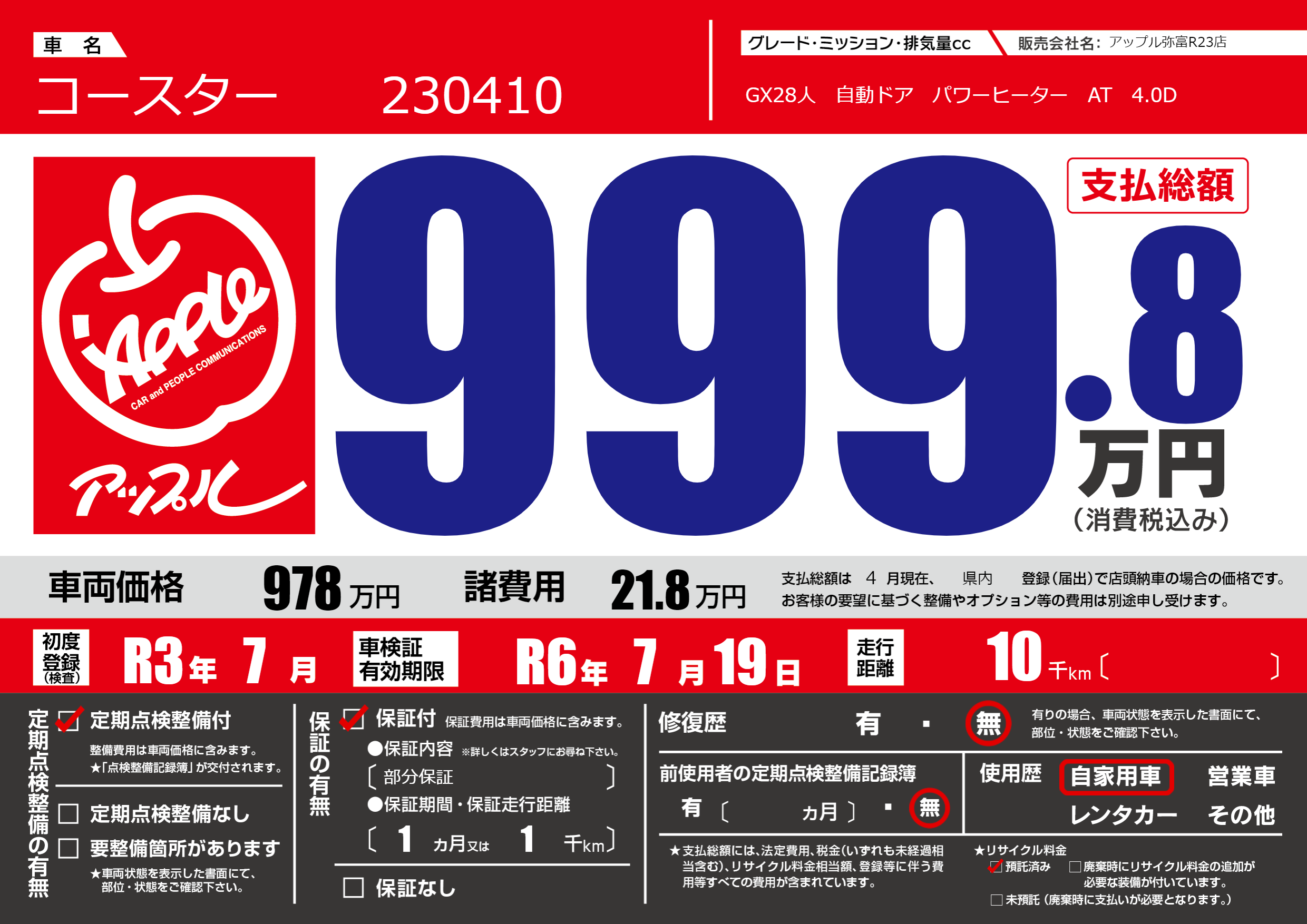 | 車名 | コースター 230410 | グレード ミッション 排気量 |