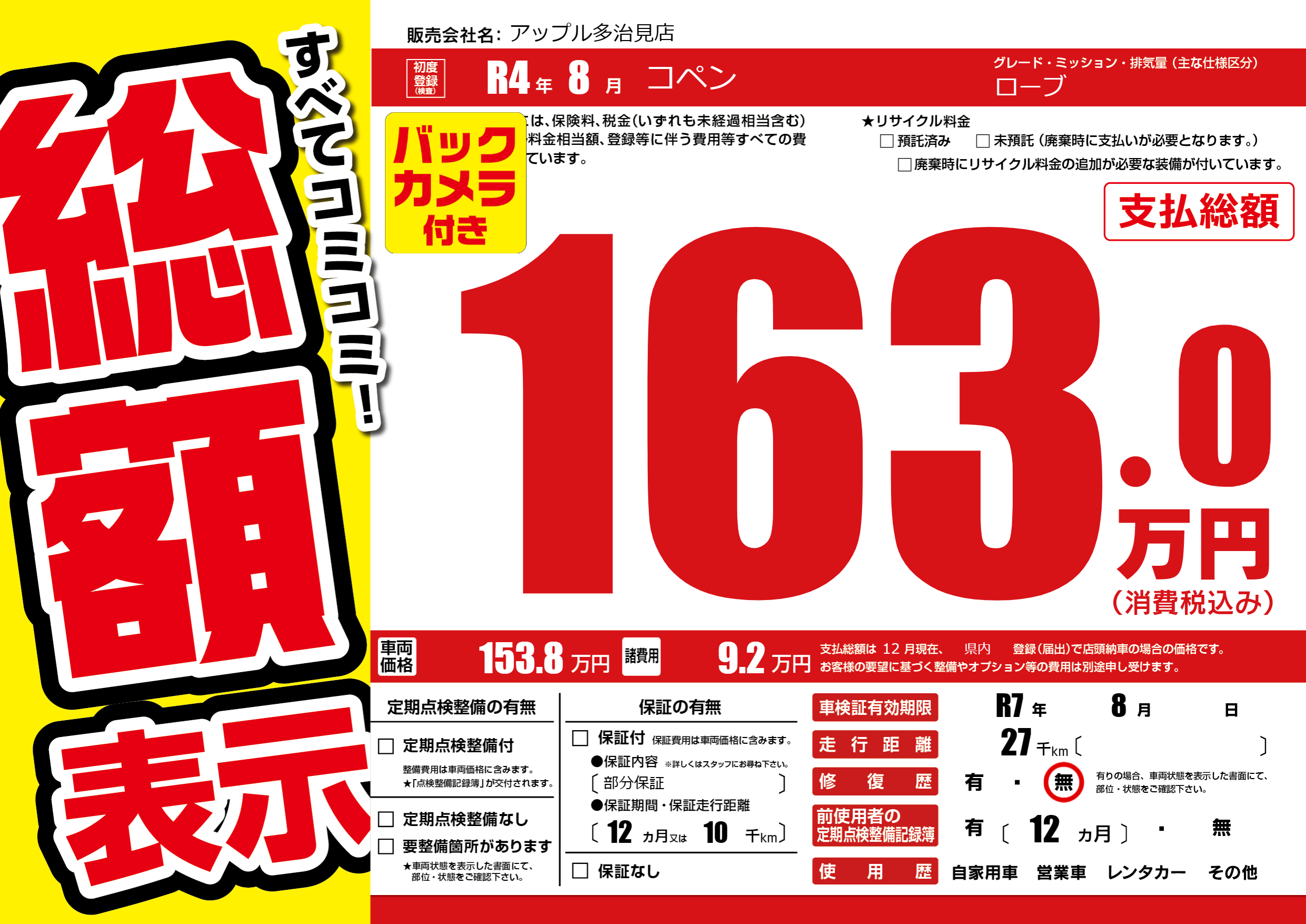 | 走行キロ | 2.7万km | 初年度登録 | R4年8月 |