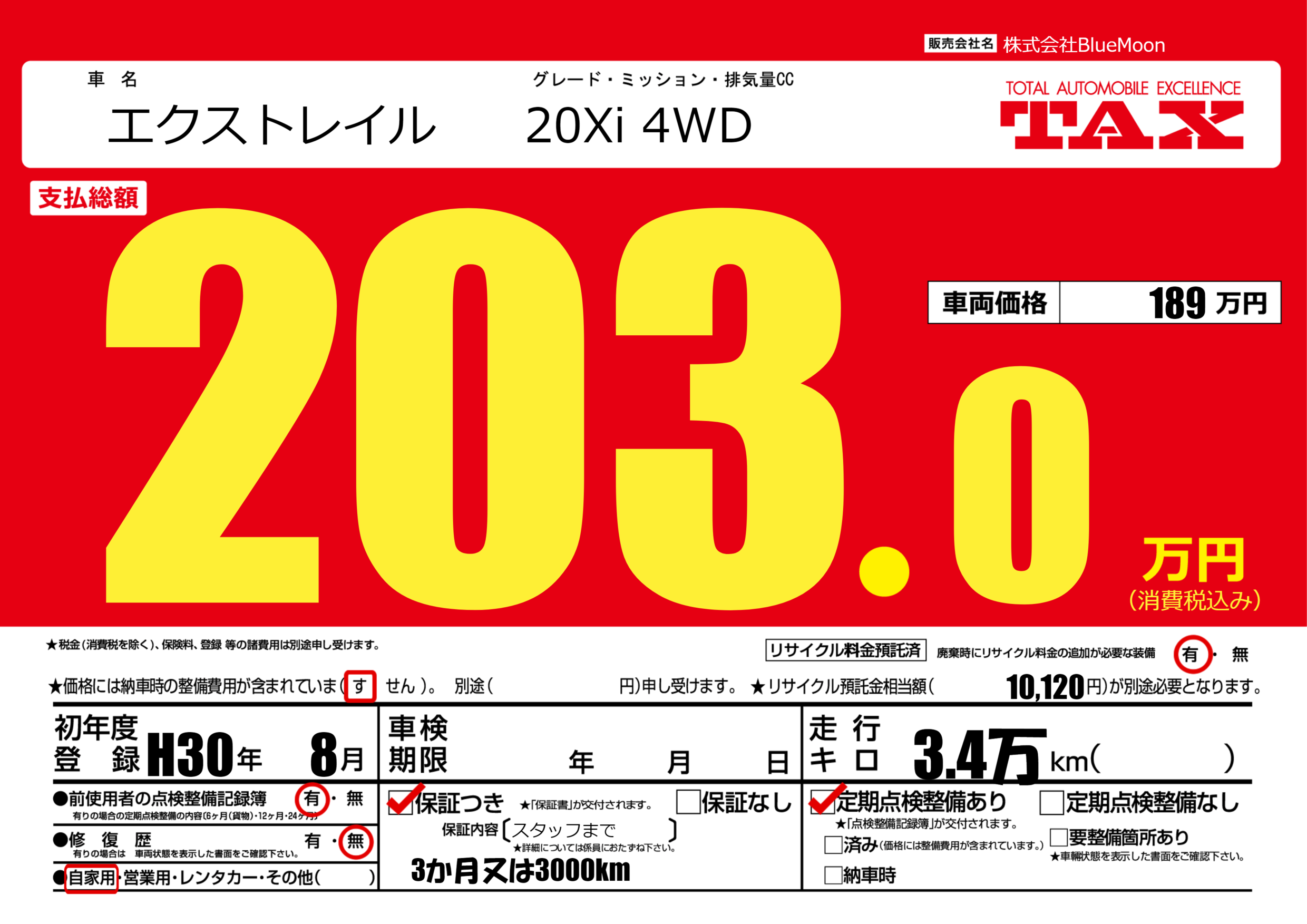 | 走行キロ | 0.3万km | 初年度登録 | H30年8月 |