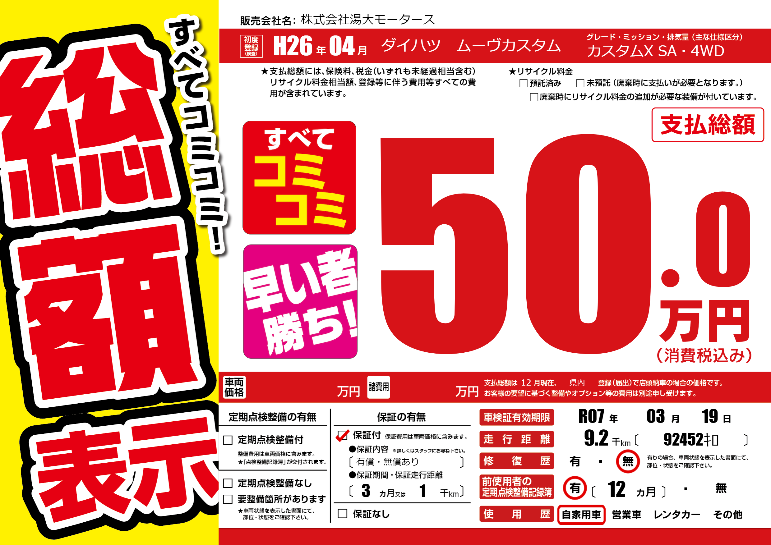 | 車名 | ダイハツ ムーヴカスタム | グレード ミッション 排気量 |