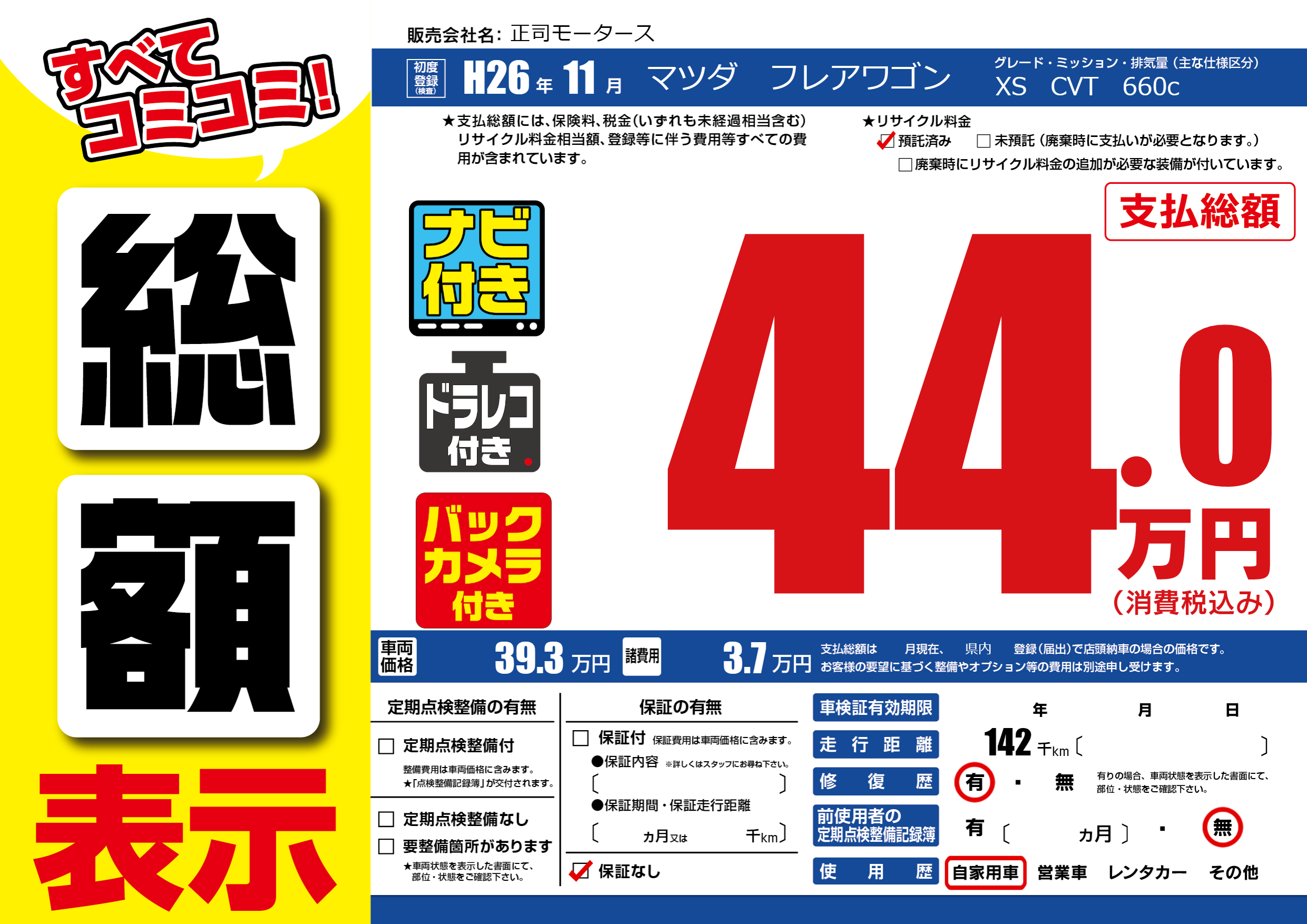 | 車名 | マツダ フレアワゴン | グレード ミッション 排気量 |