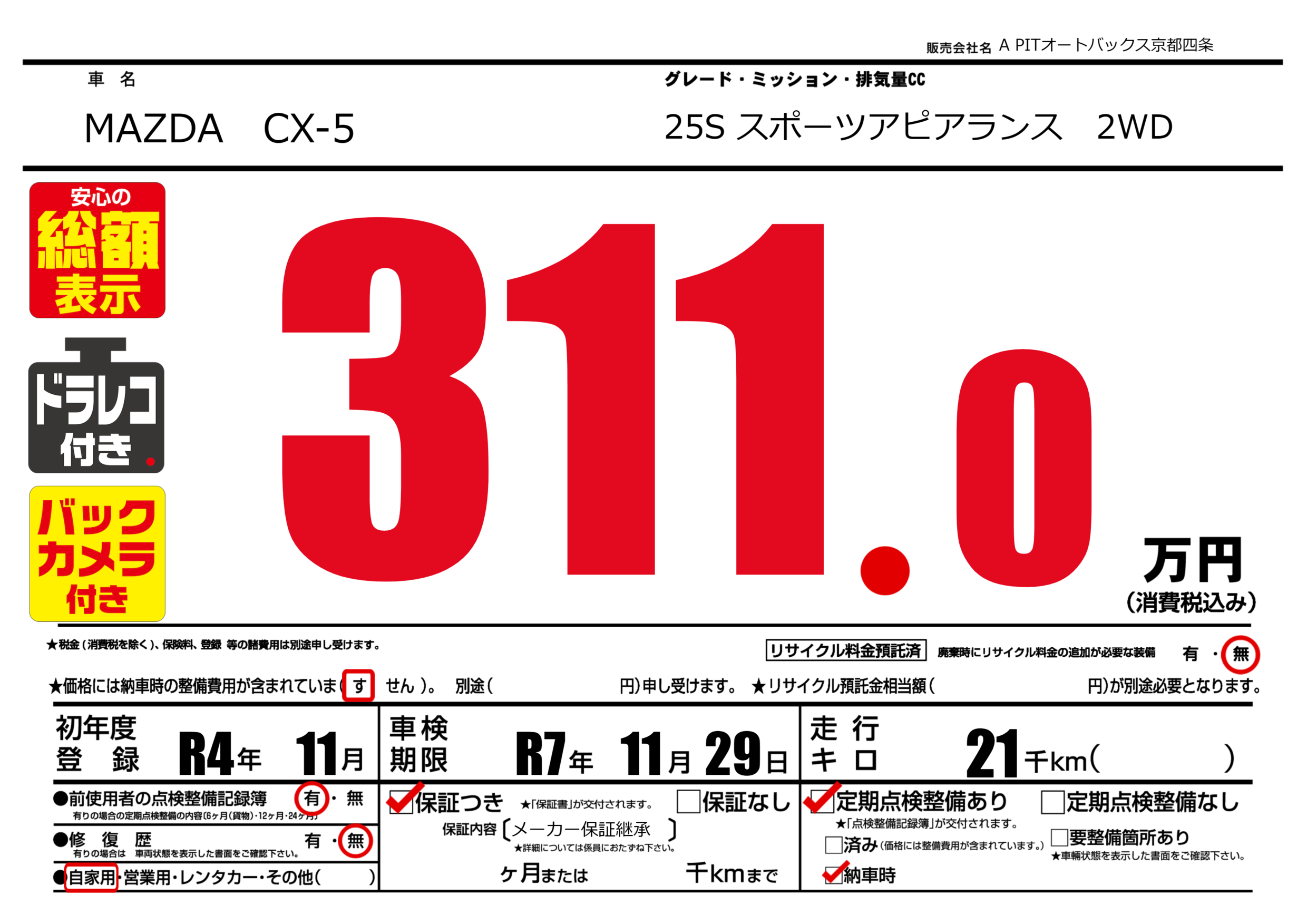 | 車名 | MAZDA CX-5 | グレード ミッション 排気量 |