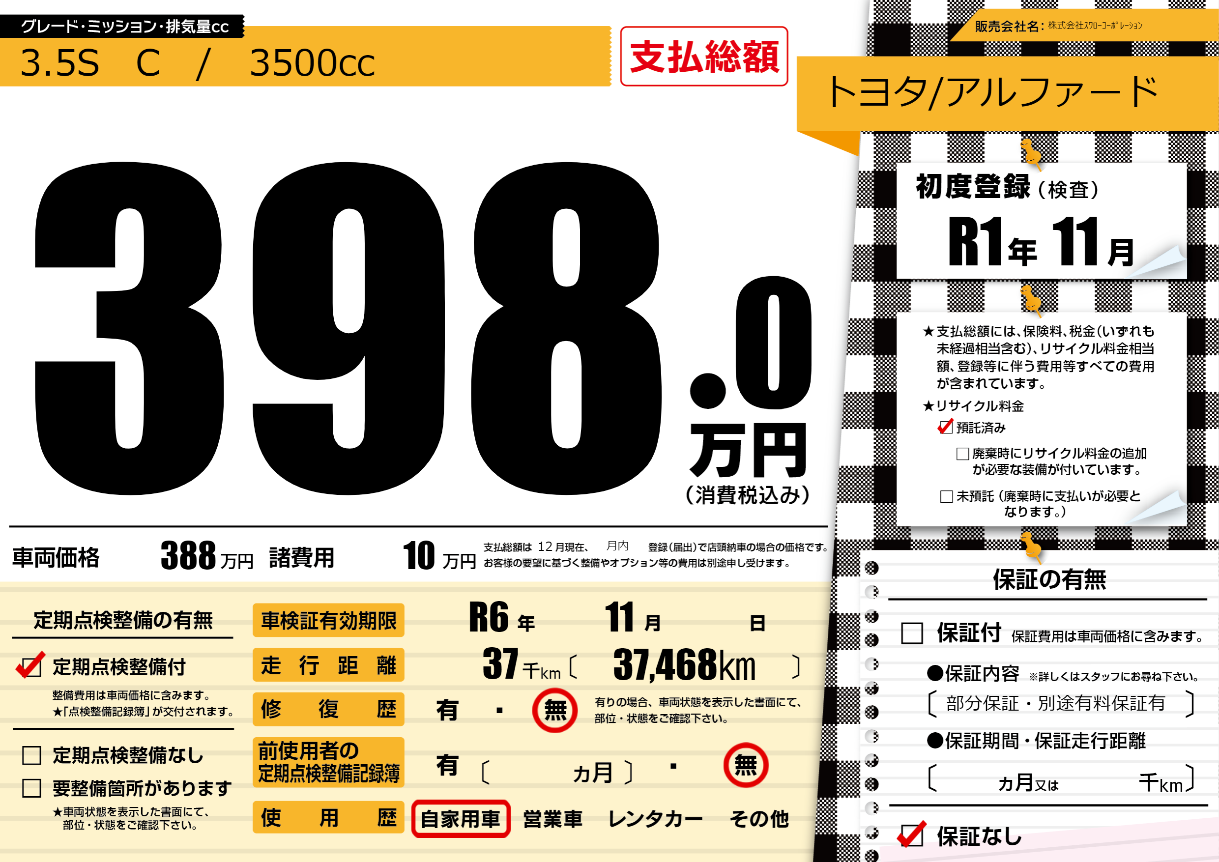 | 車名 | トヨタ/アルファード | グレード ミッション 排気量 |