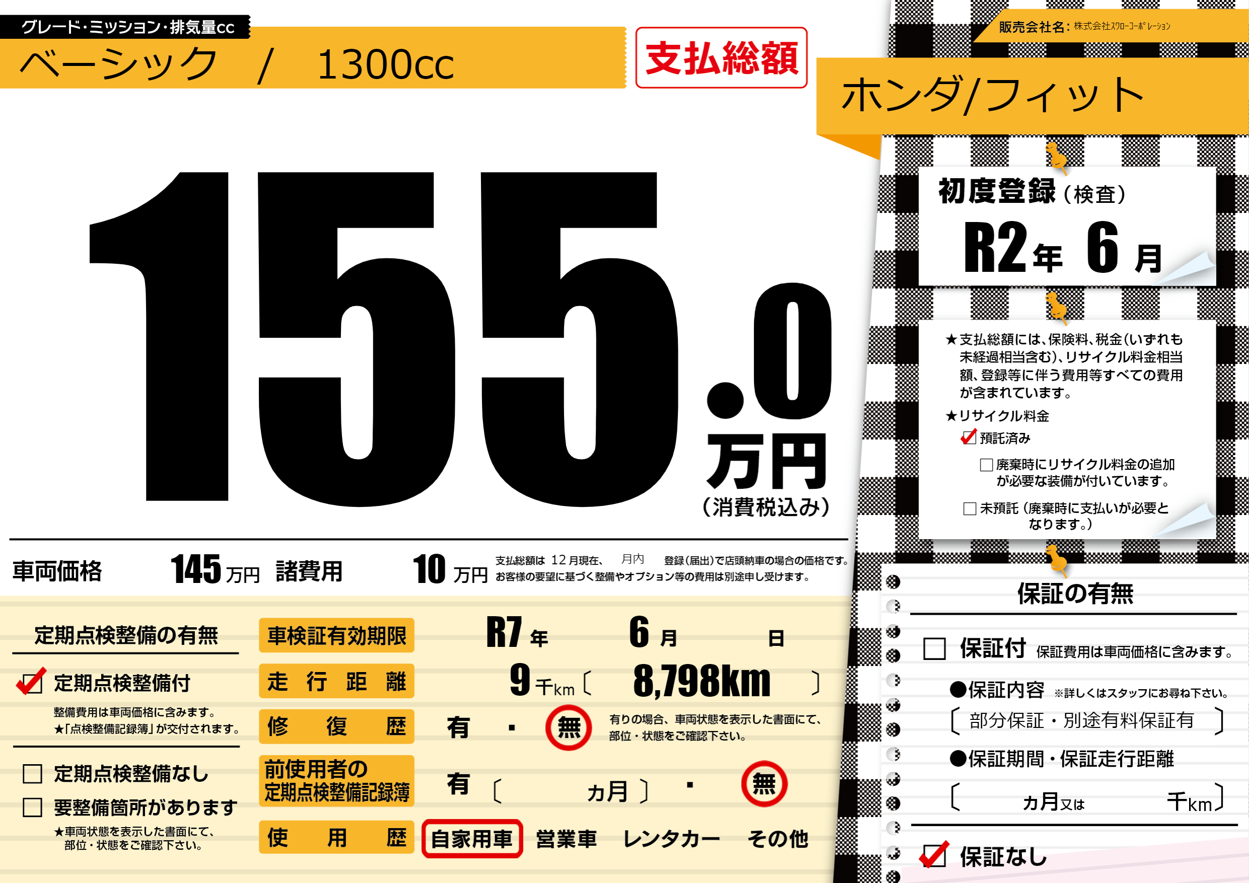 保証なし 保証内容(部分保証・別途有料保証有) ---ヶ月または()千kmまで |