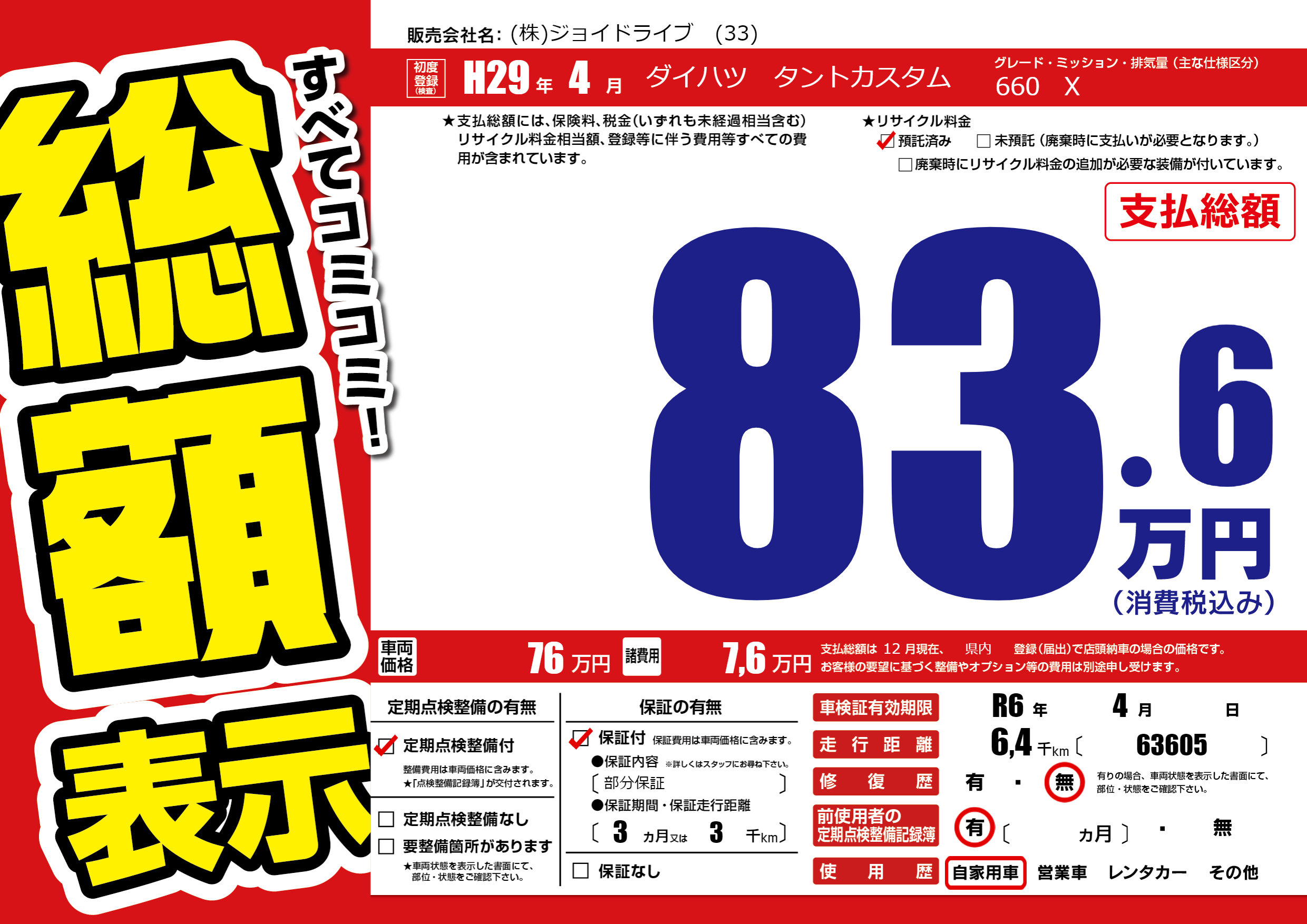 | 車名 | ダイハツ タントカスタム | グレード ミッション 排気量 |