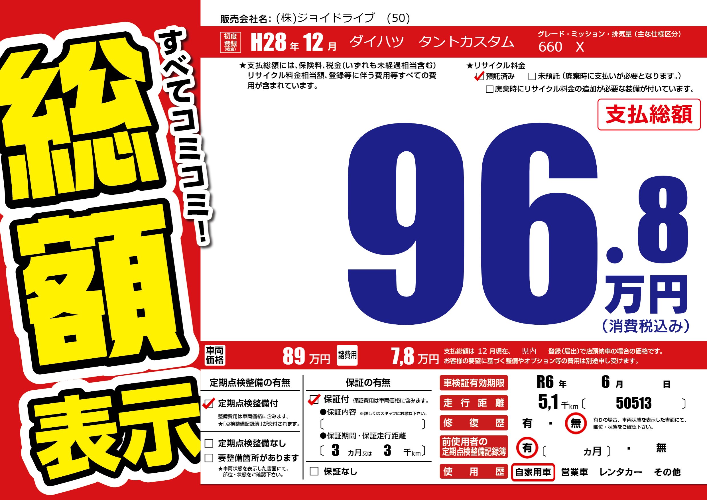 | 車名 | ダイハツ タントカスタム | グレード ミッション 排気量 |