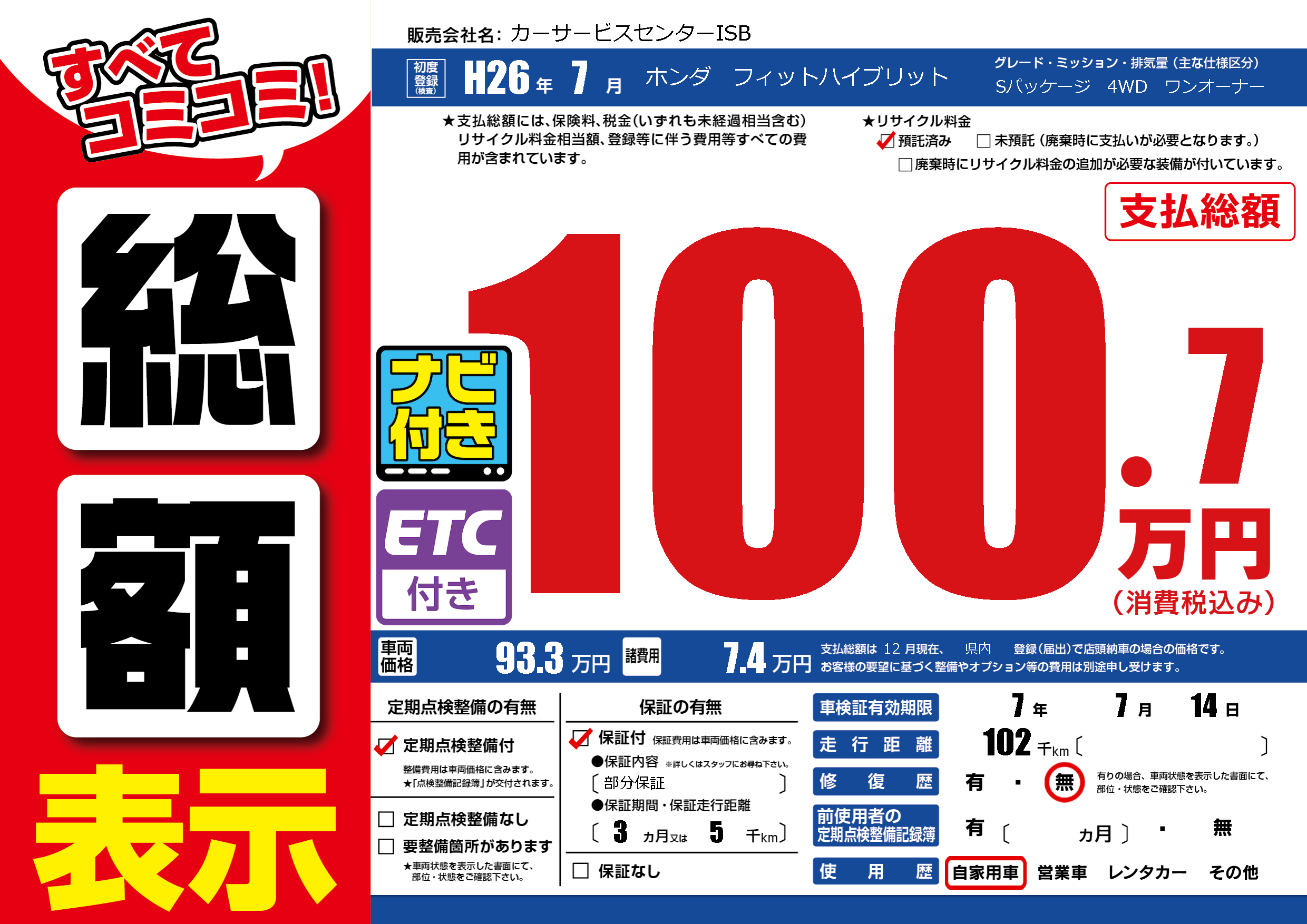 | 走行キロ | 10.2万km | 初年度登録 | H26年7月 |