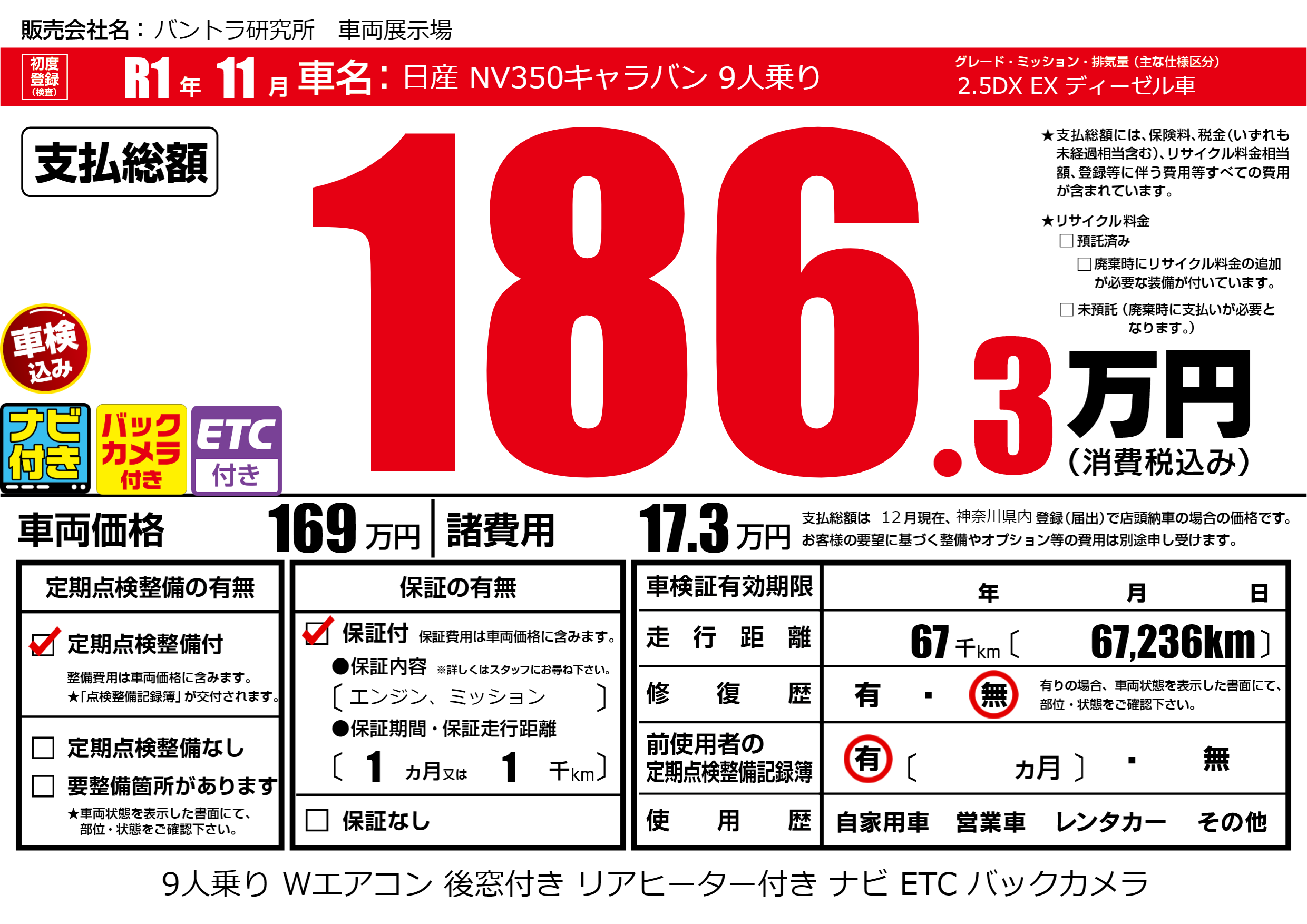 | 車名 | 日産 NV350キャラバン 9人乗り | グレード ミッション 排気量 |