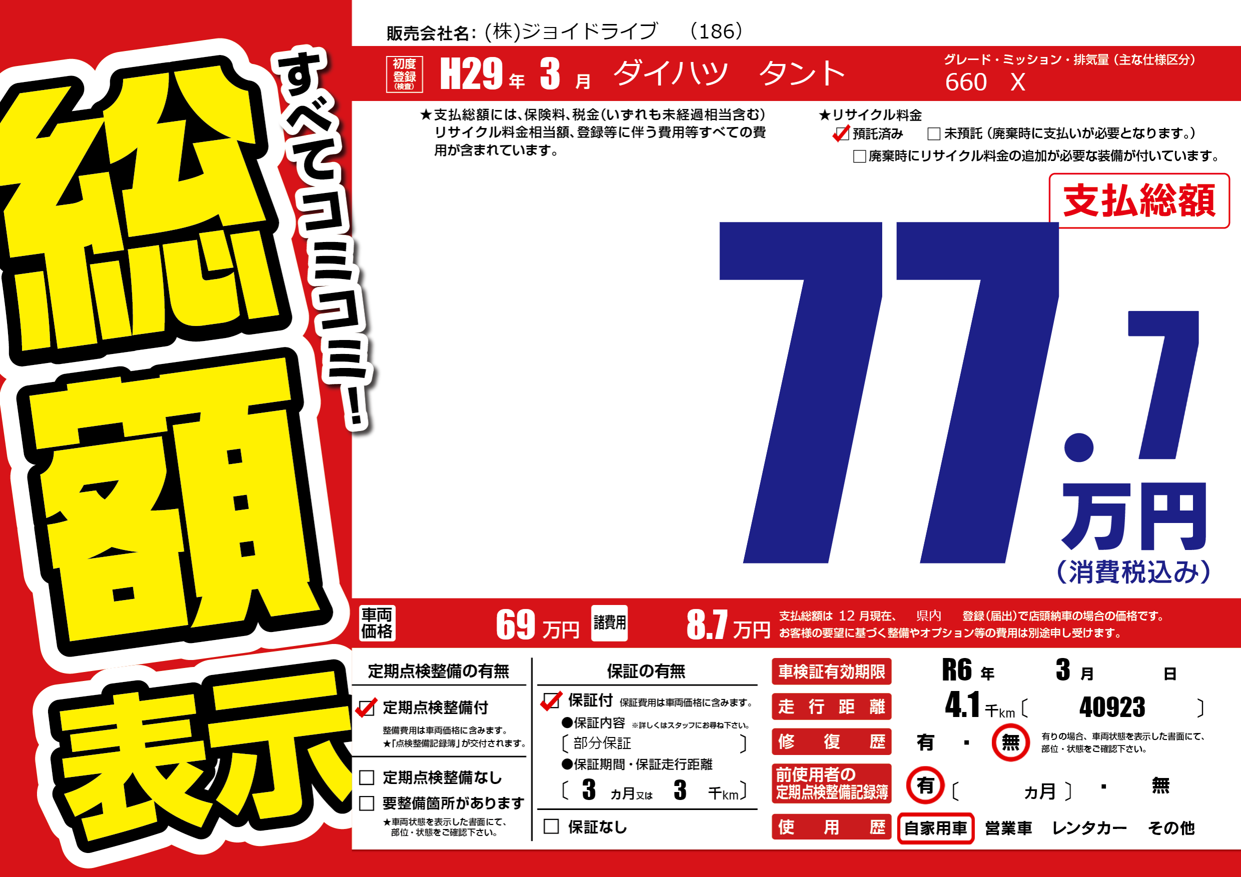 | 車名 | ダイハツ タント | グレード ミッション 排気量 |