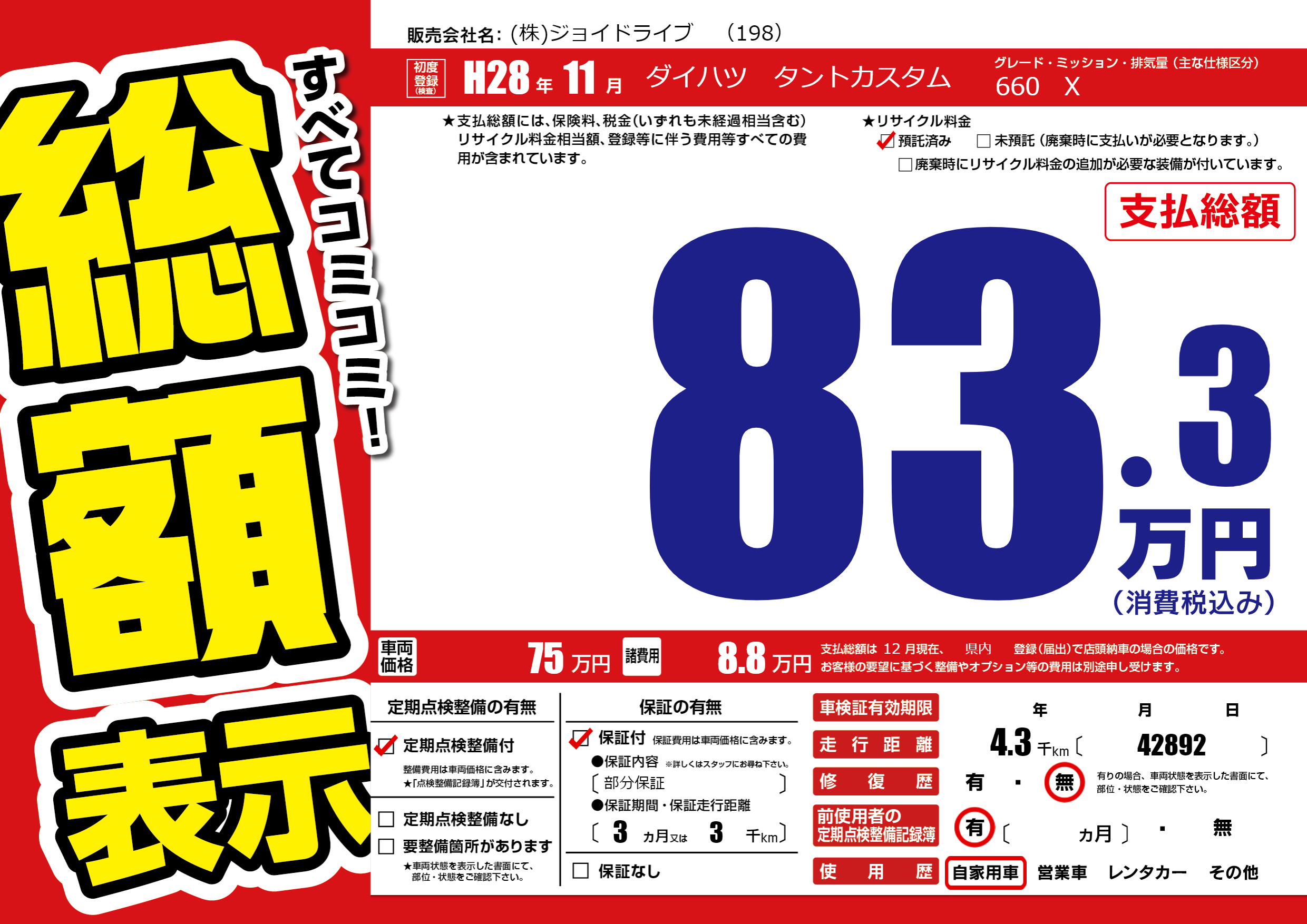 保証付き 保証内容(部分保証) 3ヶ月または(3)千kmまで |