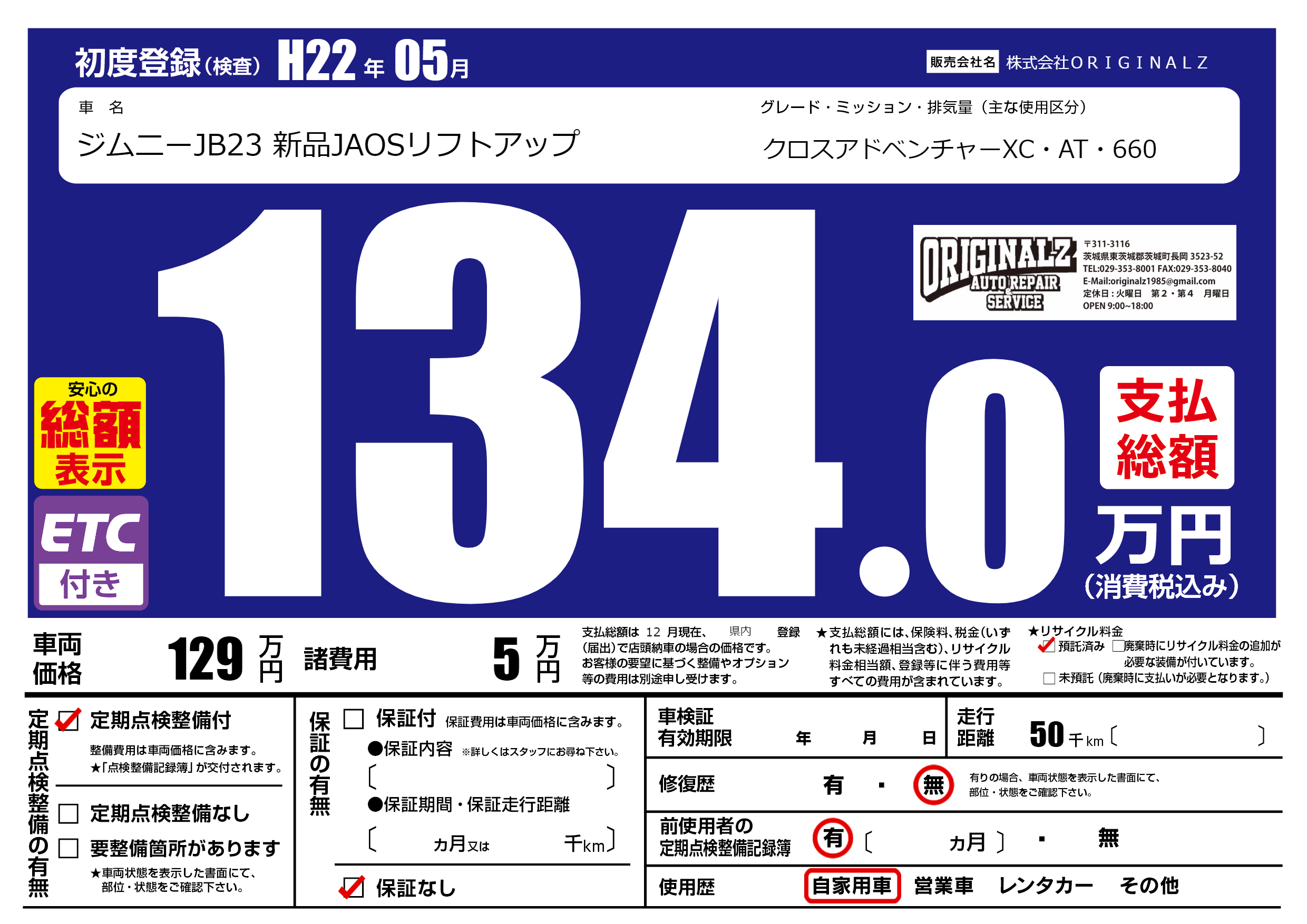 | 走行キロ | 5万km | 初年度登録 | H22年05月 |