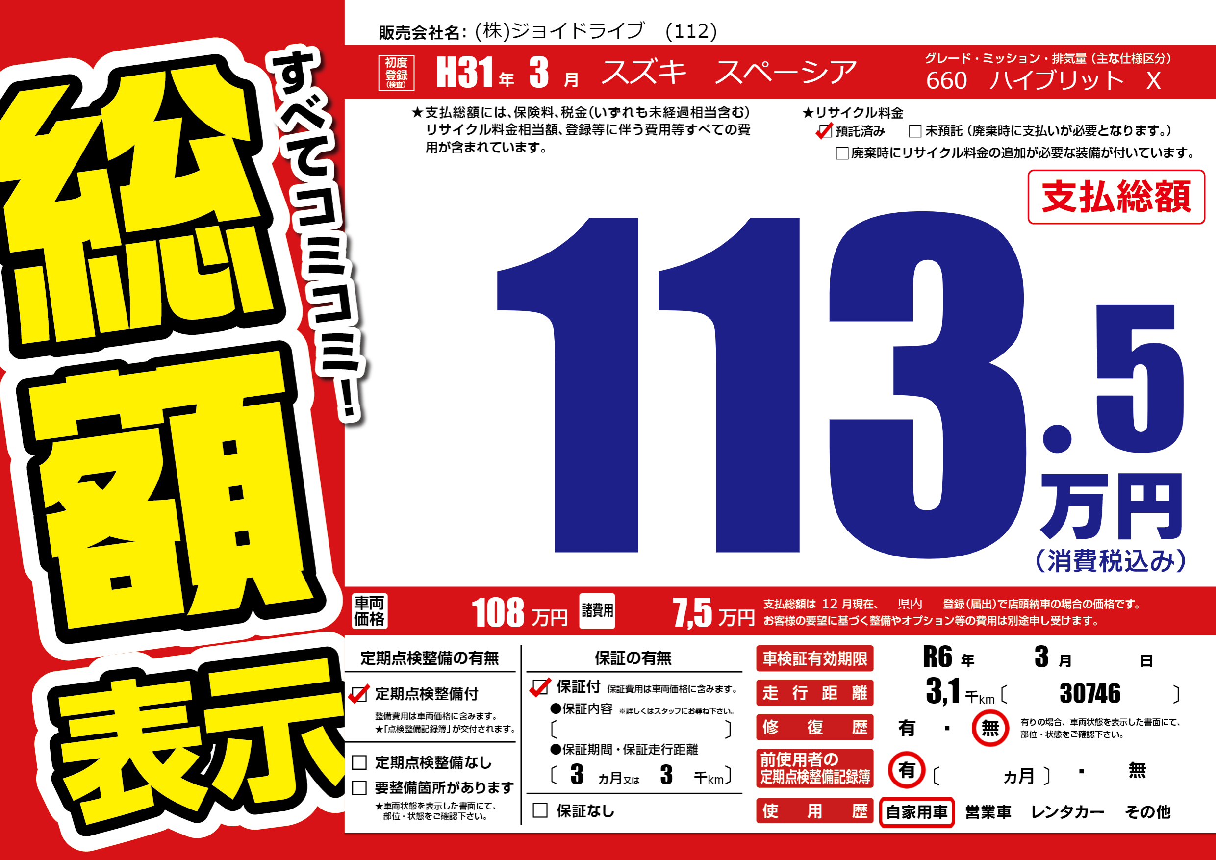 | 走行キロ | 0.3万km | 初年度登録 | H31年3月 |