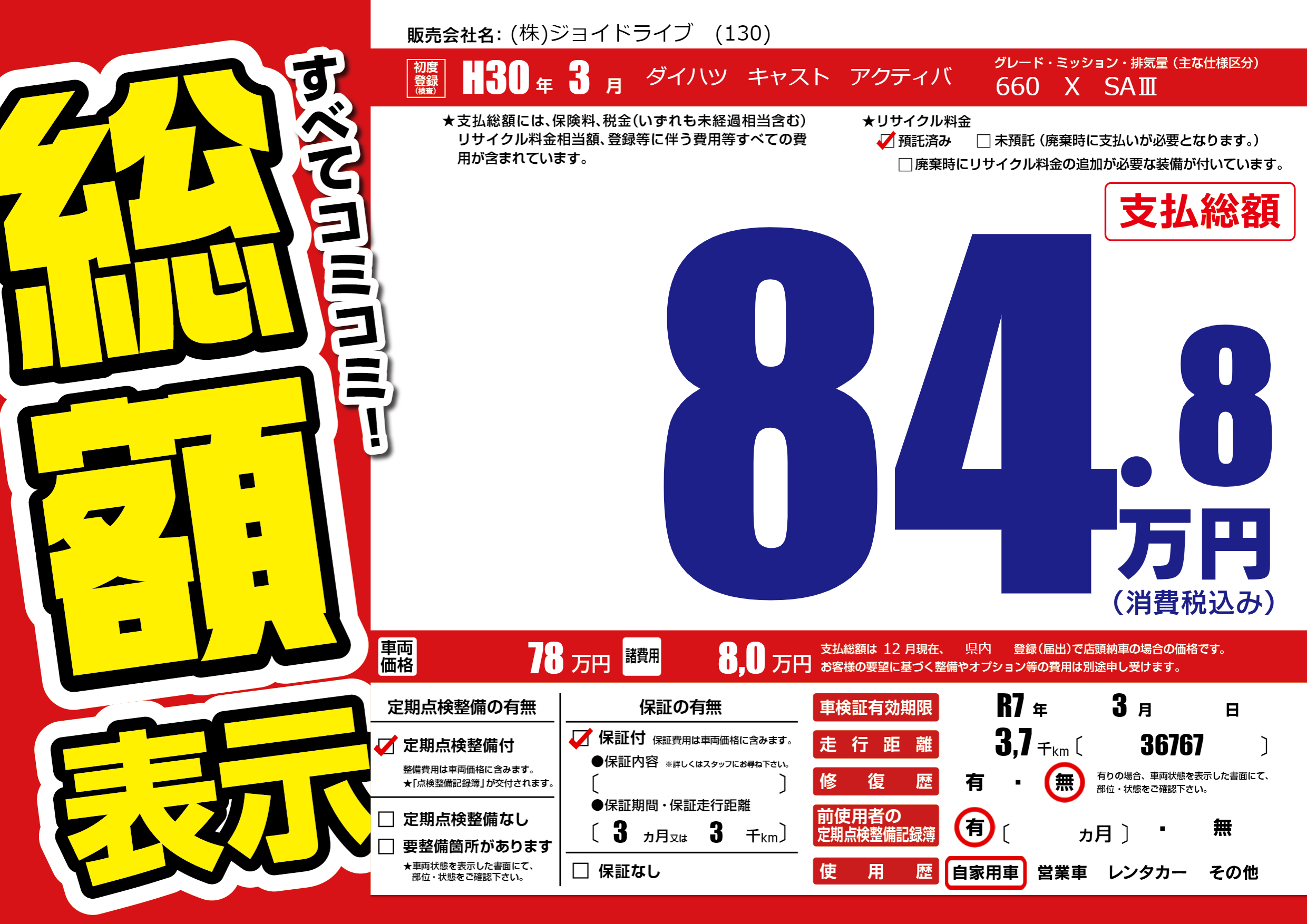 | 走行キロ | 0.3万km | 初年度登録 | H30年3月 |